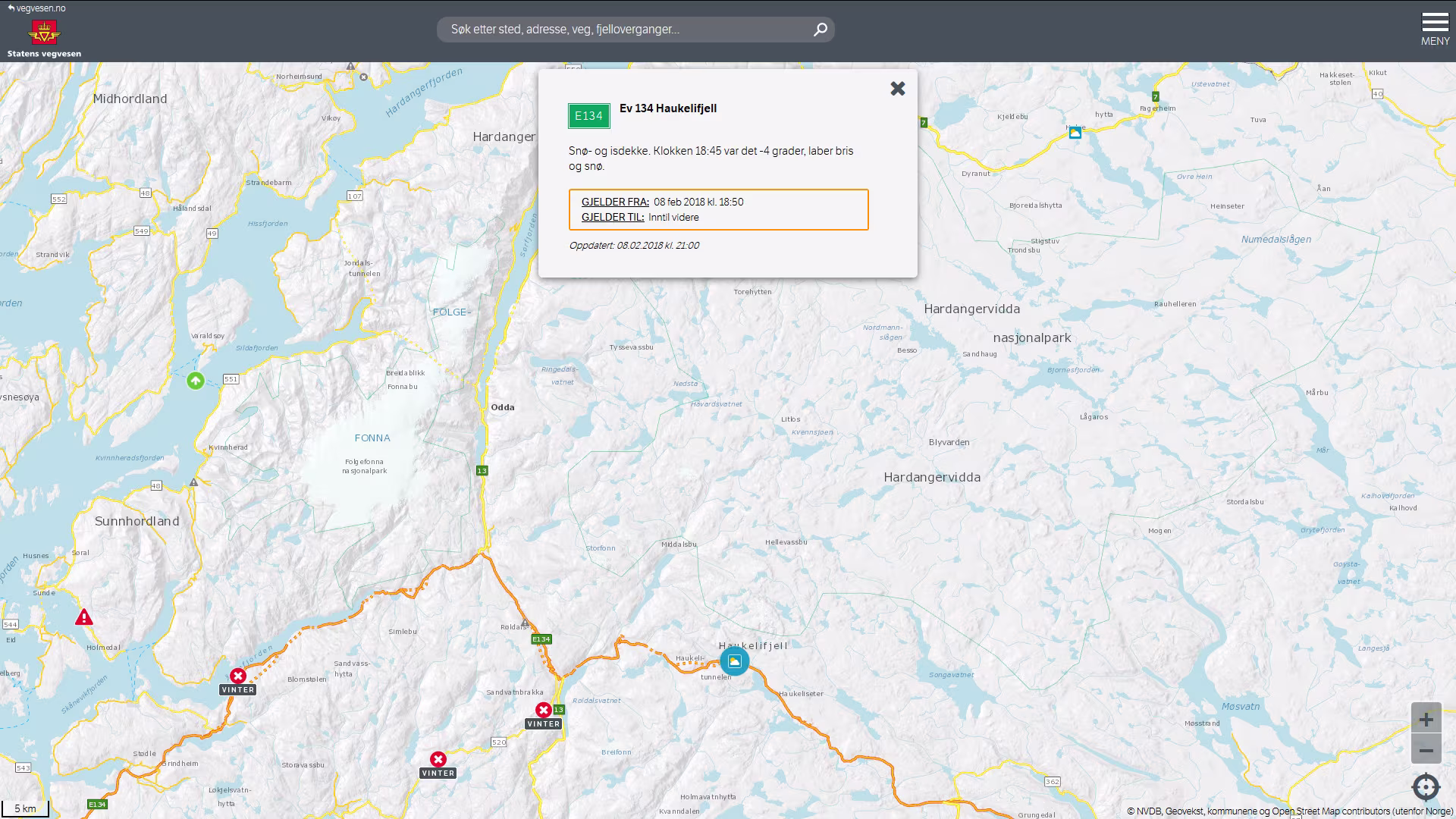 - Ab Norheimsund entweder die [49] in Richtung Süden zur Fähre von Tørvikbygd nach Jondal oder alternativ dem [Fv 7] Richung Oslo folgen. Vom [Fv 7] rechts abbiegen auf den [Rv 13] durch den Vallaviktunnelen, noch im Tunnel verzweigt die Strecke über die Hardangerbrua (150 NOK) die über den Eidfjord führt. Aber vermutlich ist die Brücke zeitlich keine Option, denn auch wenn ich die Fähre gespart habe ist es ein gehöriger Umweg 605 km statt 546 km. Die Fähre in Tørvikbygd fährt um 07:45 Uhr, presis