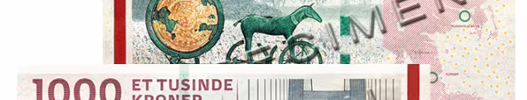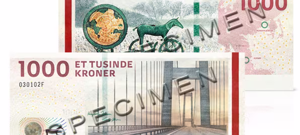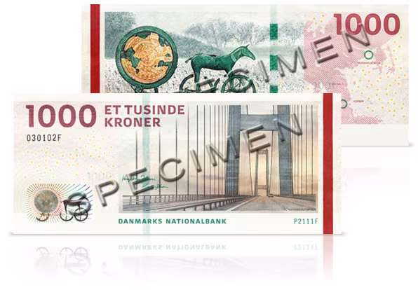 1000-kronesedlen – Storebæltsbroen og Solvognen. © Danmarks Nationalbank
