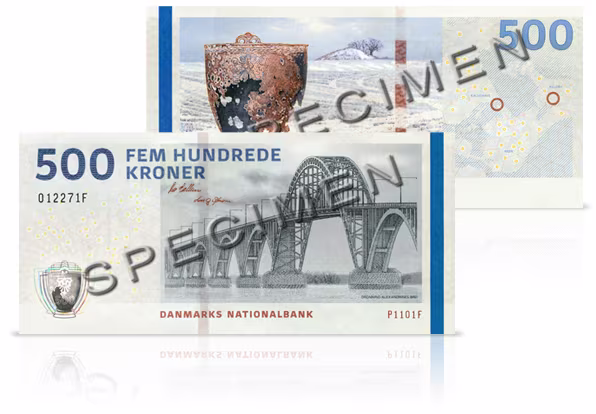 500-kronesedlen – Dronning Alexandrines bro og bronzespanden fra Keldby. © Danmarks Nationalbank