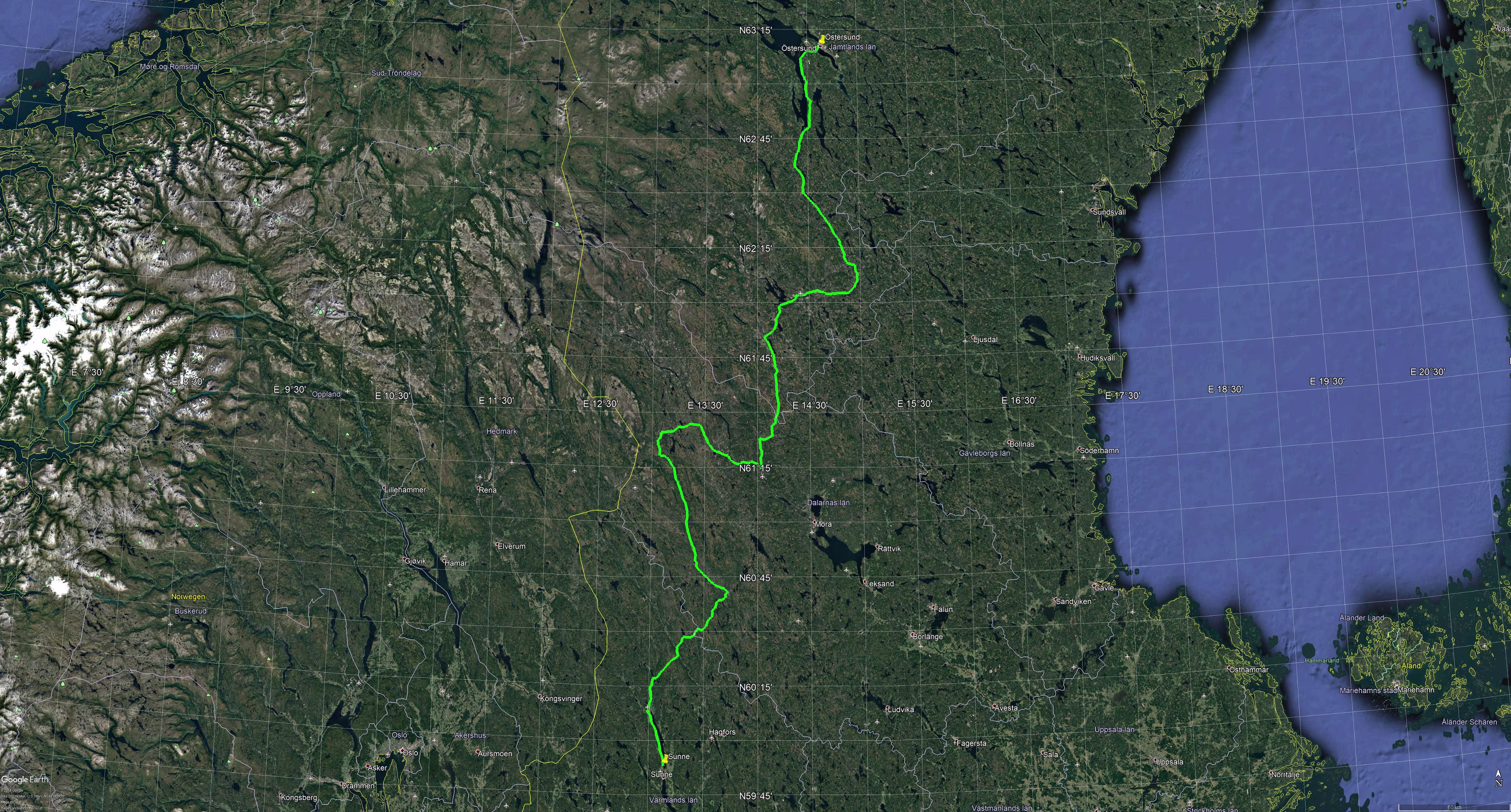 Auf der Karte sieht das auf den ersten Blick harmlos aus, aber unmittelbar an der Wegstrecke (einem Abschnitt auf der [311]) steht ein Berg (Fjätervålen) mit 1001 m. Auf einem Streckenabschnitt geht es auf 847 m ü. d. M. hoch und G__gle Streetview zeigt eine sehr schmale Single-Track-Road. Üha, ob diese Straße im Winter überhaupt befahrbar ist, kaum zu glauben. Die vorgeschlage Strecke, 7 Std. 12 Min. / 601 km. Da wäre allerdings der Straßenabschnitt der auf 847 m hoch geht nicht dabei.