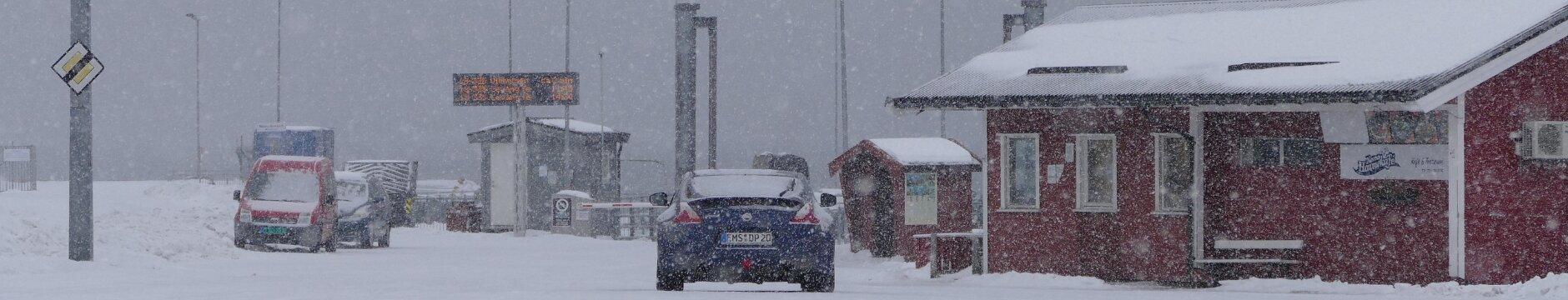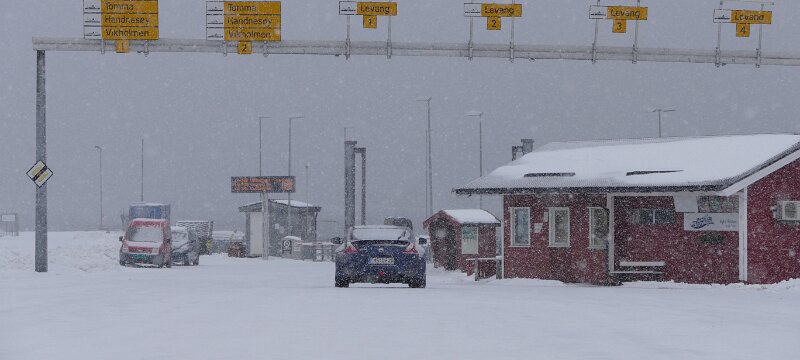 Beim Anlaufen von Nesna wurde die See etwas rauher und ich hoffte, dass das nun auch gut gehen wird, was auch der Fall war. Meine weitere Fähre nach Levang fuhr ca. eine halbe Stunde später. Es schneite wie wild und der Wagen war in der Wartezeit gut verschneit. Die Überfahrt dauerte nicht lange. Auf der kleinen Fähre standen sonst nur noch ein LKW und drei weitere Autos. Ich kann mir nicht vorstellen, dass die Fähre mit einer „schwarzen“ Null betrieben werden kann.