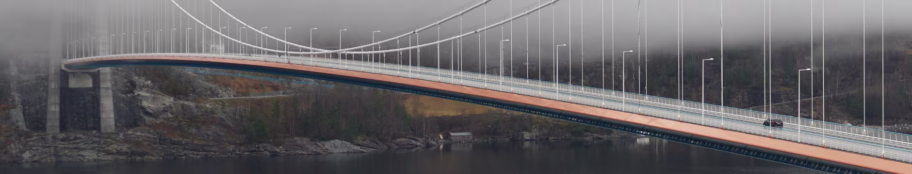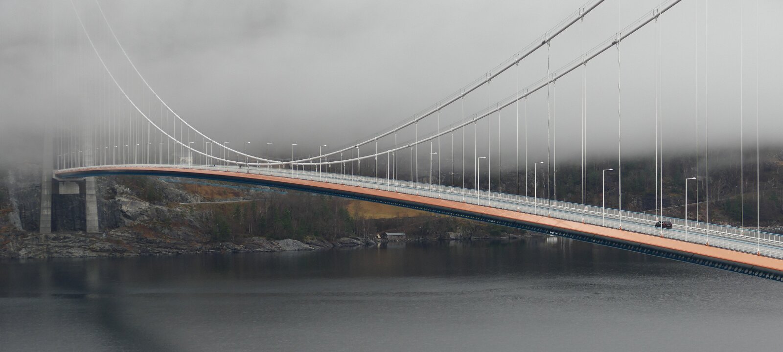 Ab Odda dann also östlich am Hardangerfjord entlang, die Straße kannte ich noch nicht. Sie ist deutlich kurvenreicher und schmäler als die Westuferstraße. Bevor es dann über die Hardangerbrua ging bin ich noch mal kurz von der Straße abgebogen, mitten an einem Kreisel im Tunnel und habe einen Parkplatz angesteuert. Von dort aus ging es am Hang einen Weg nach unten, immer die Brücke im Blick. Im Moment habe ich die Zahlen nicht im Kopf, aber sie ist glaube ich kürzer als die Hålogalandsbrua. Aber definitiv nicht minder imposant. Auf der Brücke hat es nicht nur zwei Fahrspuren für Fahrzeuge sondern auch einen richtig breiten Weg für Fußgänger und Fahrradfahrer. Der Weg den ich entlang lief führte direkt in den Tunnel hinein, der dann unmittelbar auf die Brücke übergeht. Es war mehr oder weniger windstill und somit überhaupt kein Problem sich auf der Brücke aufzuhalten. So etwa 1/3 der Strecke über die Brücke bin ich wohl gelaufen, es fing an zu regnen. Aber so schnell wie es anfing hörte es auch wieder auf.