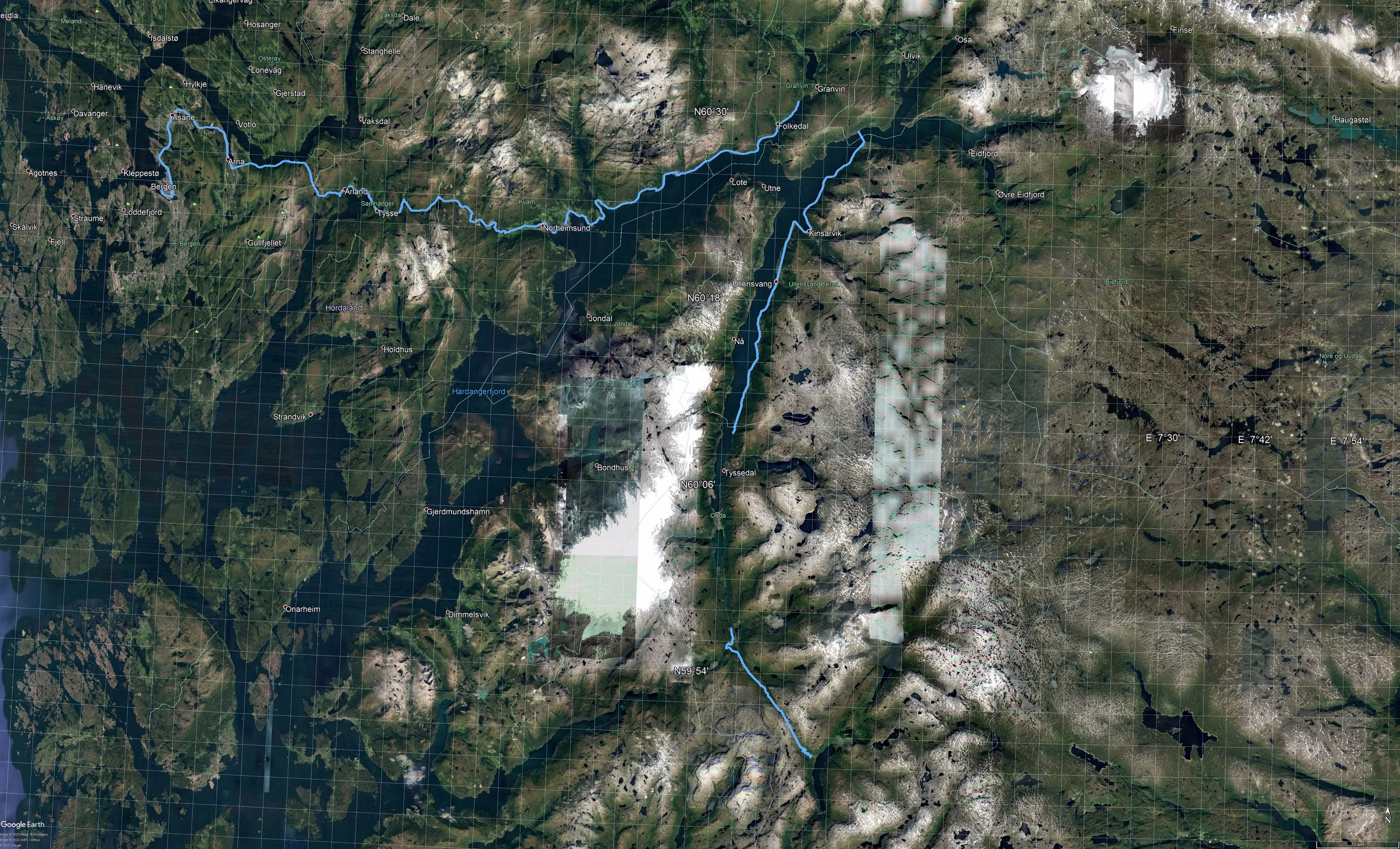 Bis Odda gibt es erstmal keine (sinnvolle) Wahlmöglichkeit, denn der [E134] in Richtung Haugesund zu folgen ist nicht möglich, weil die Straße im Winter gesperrt ist. Nach Odda hat man dann die Wahl, entweder durch den Folgefonntunnelen und über die Fähre Jondal – Tørvikbygd (sonntags fährt die Fähre immer zur Stunde 20) oder weiter am westlichen Hardangerfjord und über die Fähre Utne – Kvandal (sonntags fährt Fähre immer zur halben Stunde). Beide Varianten bin ich schon gefahren.