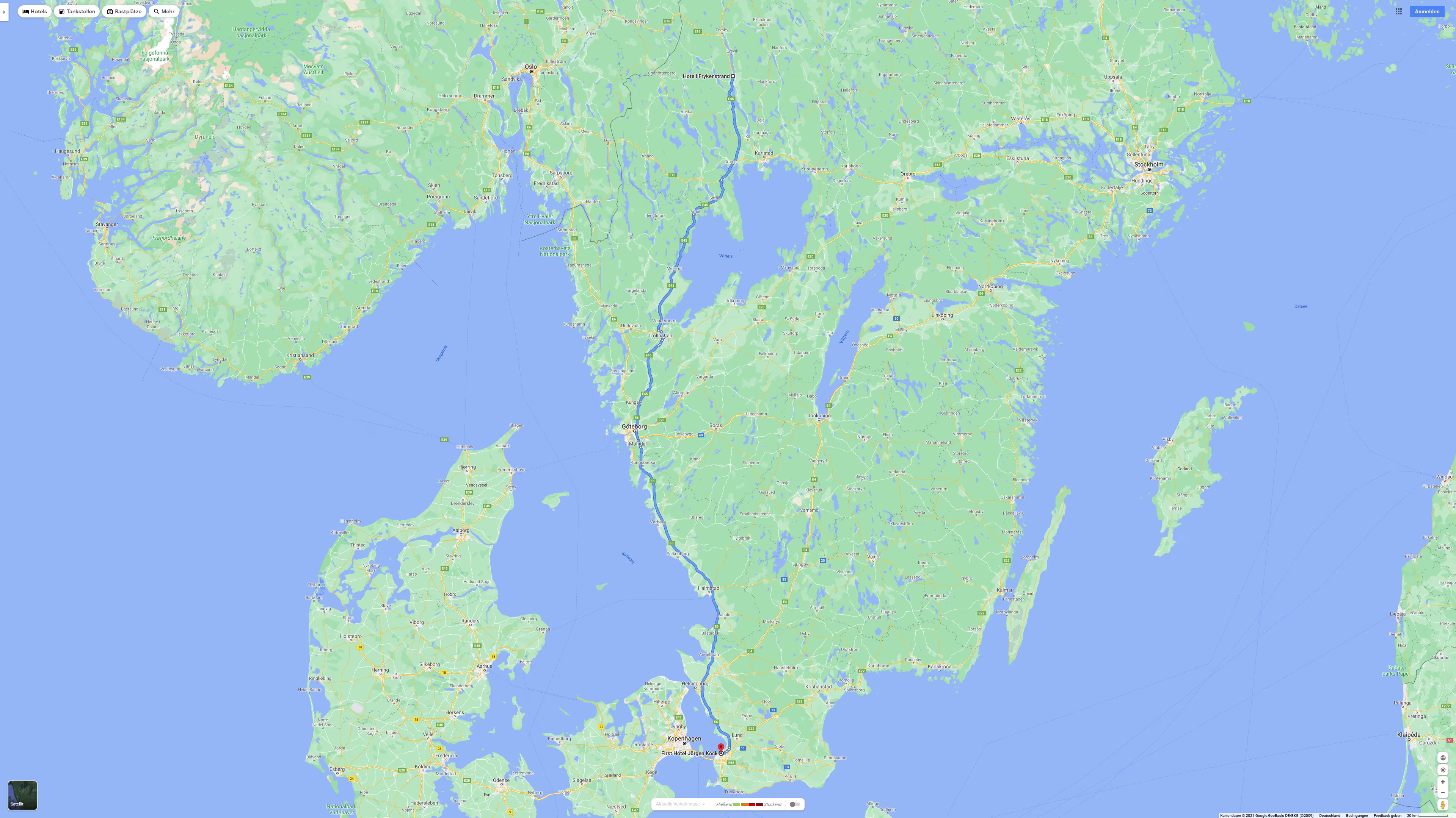 So ganz klare Präferenzen habe ich noch keine, es gibt ja nicht nur prinzipiell die beiden Varianten entweder östlich oder westlich um den Vänern herum. Speziell wenn man östlich herum fährt gibt es jede Menge Alternativen. Die von Google Maps vorgeschlagene Variante über die [E45] westlich am Vänern vorbei ist sicherlich die schnellste, man fährt bis Göteborg auf gut ausgebauten Landstraßen, wenn ich es recht in Erinnerung habe, dann teilweise sogar autobahn-ähnlich mit vier Spuren. Ab Göteborg dann sowieso auf der [E6], also eine vierspurige Autobahn die mehr oder weniger im Küstenbereich entlang führt und außer an einer Stelle quasi keinen nennenswerten Steigungen hat.