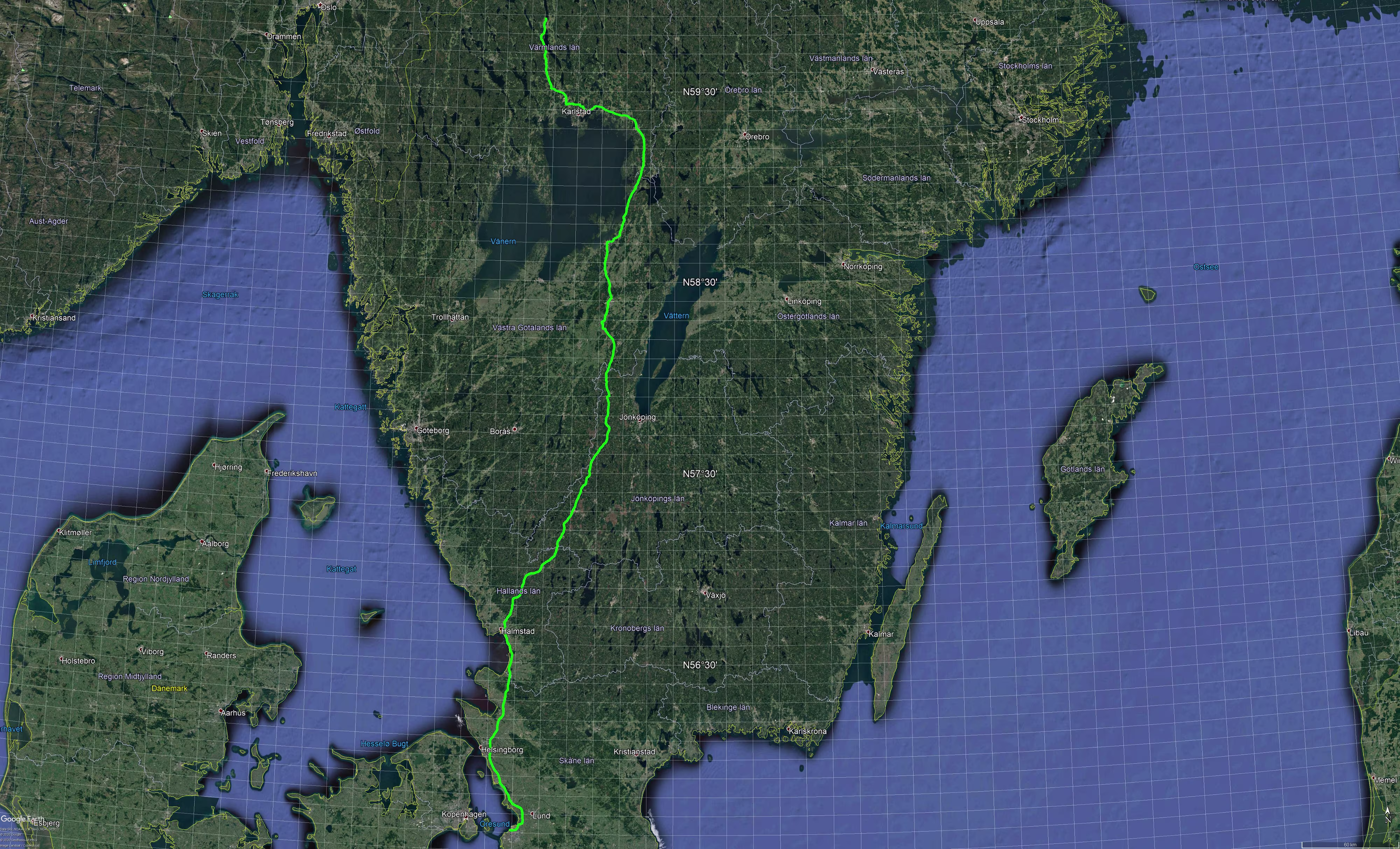 Die östliche Variante führt über Karlstad, Kristinehamn, Mariestad und dann rüber bis zur [E4] nach Jönköping. Die [E4] verläuft etwas abwechslungsreicher als die [E6], auf manchen Abschnitten ist sie sogar nur 3-spurig. Spätestens in Helsingborg trifft man dann auch auf die [E6]. Interessant fand ich meine Fahrt von Malmö nach Sunne in 2019. Damals war meine (umgekehrt verlaufende) Routenplanung Dieses Mal soll es wieder östlich am Vänern vorbei führen, allerdings nicht mehr auf der schnellen [E4] entlang, sondern auf der [E20] bis Trafikplats Halmstad Norra (Ausfahrt 45) und dann weiter auf der [26]. An Gislaved vorbei biegt man links ab auf die [27]. Später dann rechts ab auf die [157]. Nach Ulricehamn weiter auf der [46], bei Borgunda geht es wieder auf die [26]. Von da ab geht es wieder weiter auf bekannten Pfaden, vorbei an Mariestad, Kristinehamn und Karlstad.
