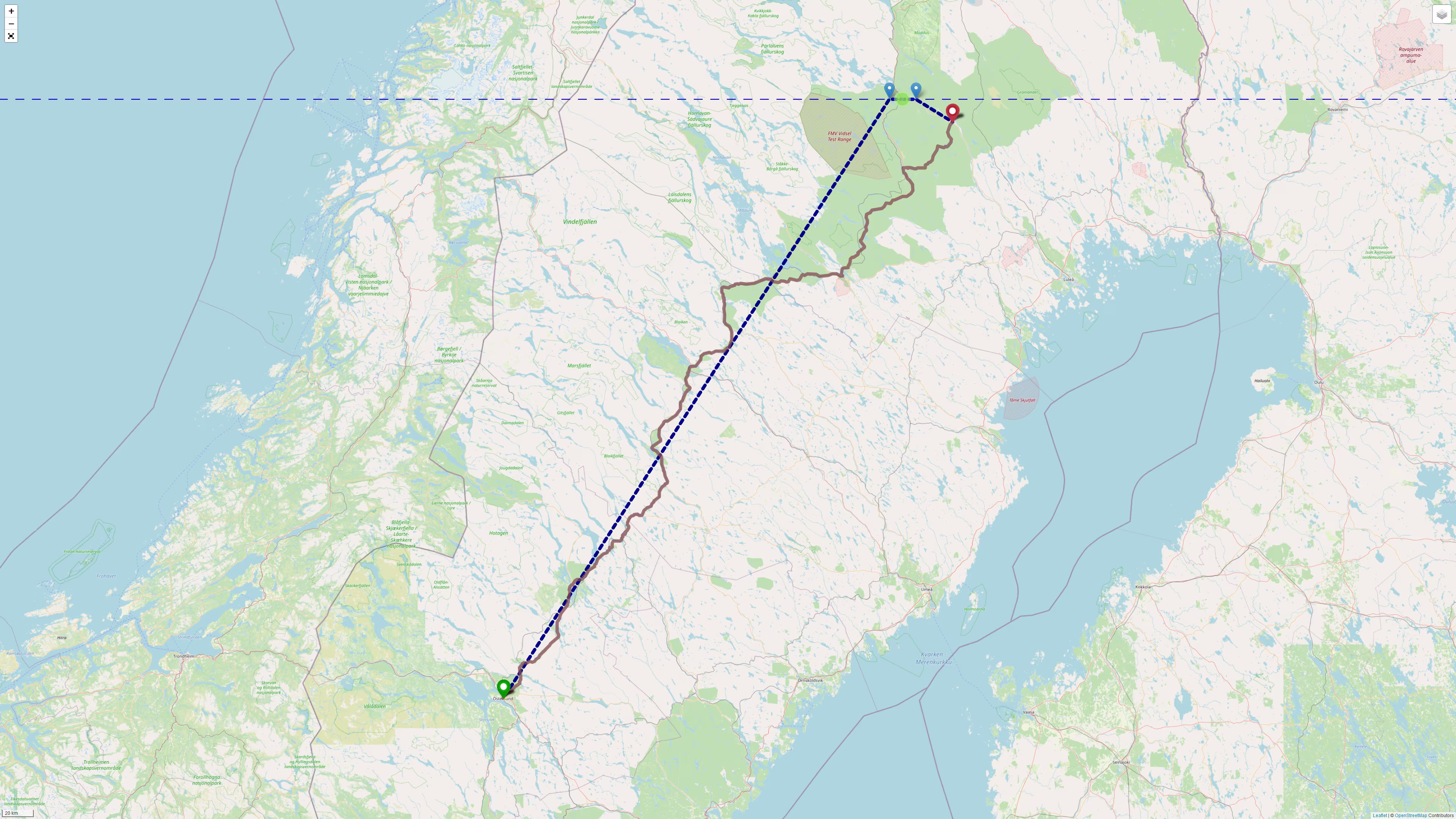 Sowohl G__gle Maps als auch OSM lotsen einem vor Jokkmokk von der [E45] runter auf eine Seitenstraße [BD 682] die in die [BD 740] übergeht und südöstlich nach Vuollerim führt. Womit man sich gleich zwei Polarkreisüberquerungen beraubt hätte. Aber diese Seitenstraße wäre mal eine willkommene Abwechslung, auch wenn sie auf G__gle Street View ziemlich schmal aussieht. Die Abkürzung bringt ca. 40 km Ersparnis.