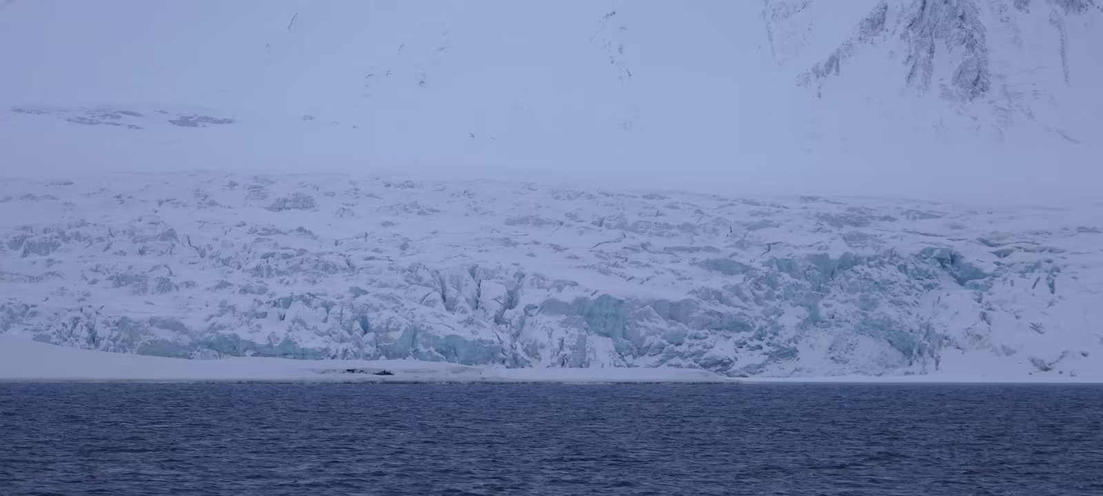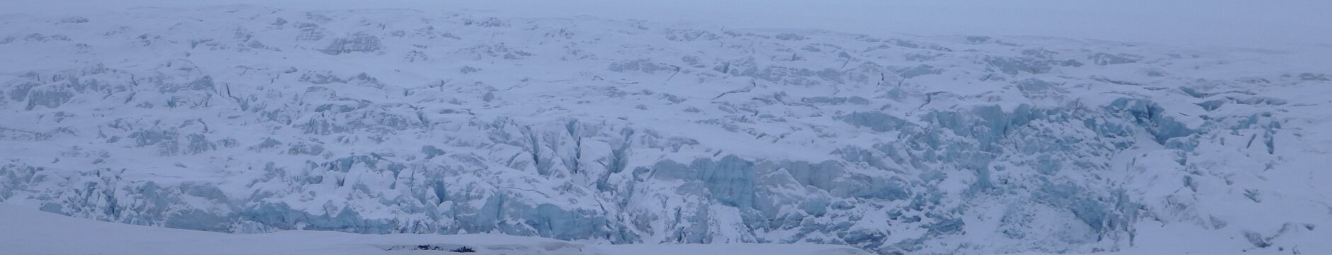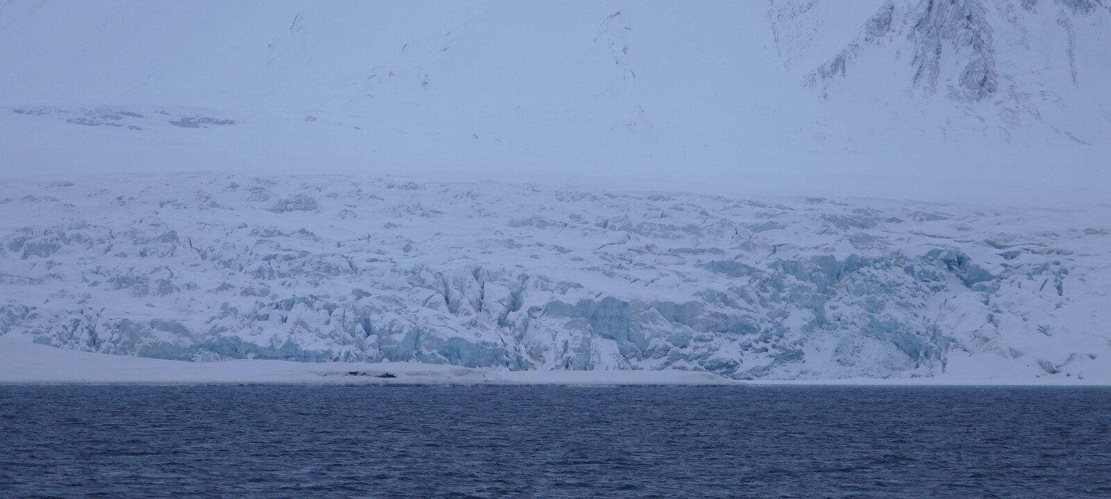 Bis wir dort waren, war allerdings von dem tollen Wetter nichts mehr geblieben, also zumindest war die Sonne weg, ansonsten war alles im grünen Bereich, also keine Monsterwellen, keine „dichte Suppe“ oder sonst was Unangenehmes. Womit ich nicht gerechnet hatte, dass wir gar nicht an die Abbruchkante des Gletschers heran fahren konnten, denn vor dem Gletscher war ein ziemlich breiter Bereich der von einer Eisschicht bedeckt war und, siehe oben, die ja nicht durchbrochen werden durfte. Also meine Schätzung war, dass das locker ein Kilometer war, der fehlte bis zur direkten Abbruchkante. Aber man kann sich da schwer verschätzen.