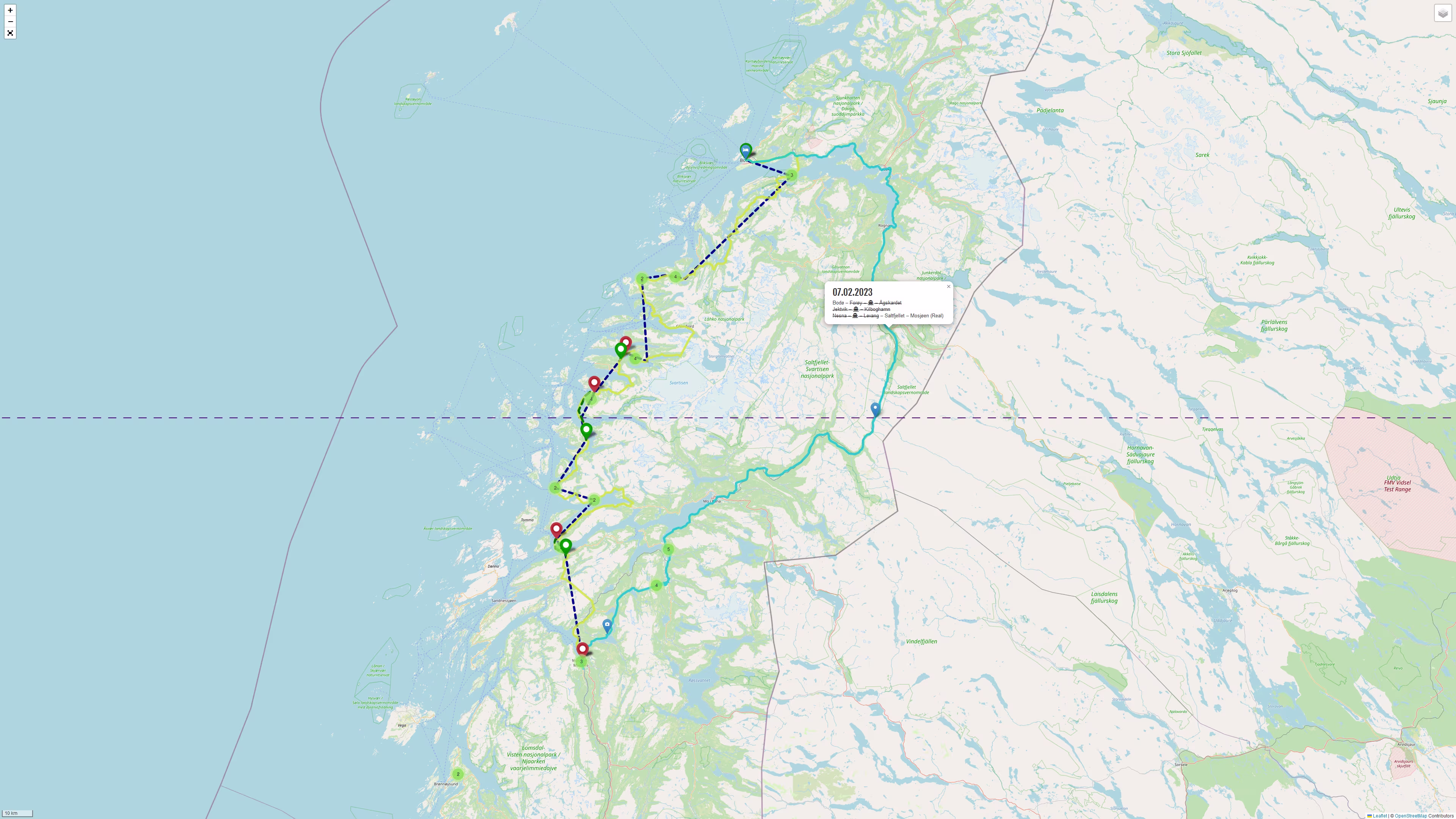 Heute die Tour ist nun wirklich nicht weit, lediglich 366 km, wenn ich denn wie geplant an der Küste entlang fahren würde. Aber wie gestern schon überlegt, das ist mir nicht geheuer, es stürmt schon an Land wie verrückt, da muss ich nicht auch noch auf drei Fähren rauf um mich durch schütteln zu lassen. Außerdem würde man bei dem schlechten Wetter vom Schiff aus eh nicht viel sehen, wenn überhaupt. Also dann doch über das Saltfjellet, es wurden Temperaturen leicht über dem Gefrierpunkt vorhergesagt und Niederschlag.