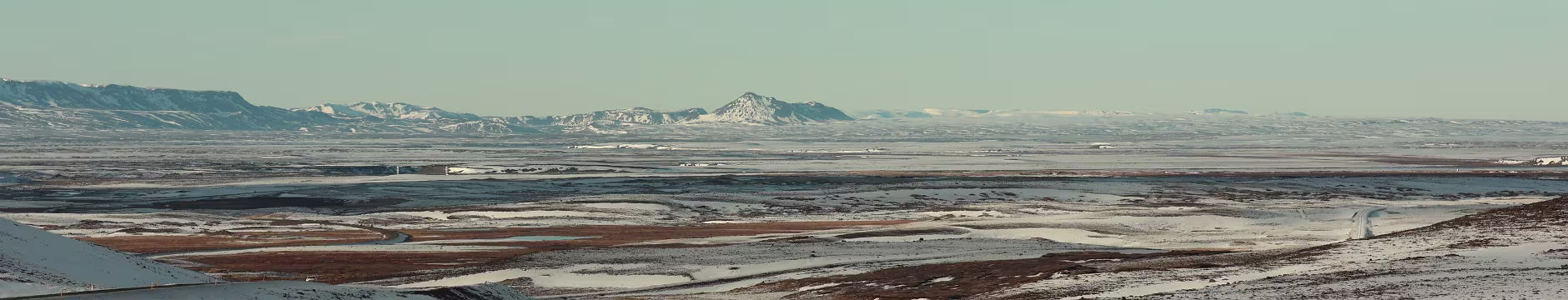 Dann geht es weiter auf der Straße, die wie recherchiert 10% Steigung hat. Und anders also ich auf Meereshöhe vermutete, war in den Höhenlagen sehr wohl Schnee auf der Straße. Aber man konnte gut fahren, keine Probleme. Auf der Hochebene ging es eine ganze Weile durch eine wunderbare Landschaft, also alles weiß, kein Baum, kein Strauch. Dann geht es bald auch schon wieder runter, nach Egilsstaðir. Und was sich da bot war der Hammer, was ein Blick. Es hatte mittlerweile aufgeklart, im Tal von Egilsstaðir lag noch ein Streifen Nebel, der Blick schien endlos zu gehen. Man konnte sich gar nicht satt sehen. Also dann weiter, dieses Mal mit 10% Gefälle. Auf meiner Rückreise werde ich diese Strecke, als einzige überhaupt, erneut passieren und es ist sicherlich eine der spannendsten und kritischsten überhaupt, sie ist berüchtigt.