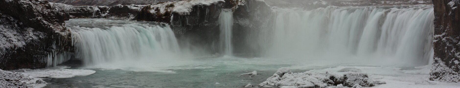 Wieder auf der [1] angekommen muss ich aber doch erst anhalten um zu prüfen, ob ich nicht doch noch mal etwas gen Osten fahren muss, um zum „Goðafoss“ zu gelangen. Und so war es, ein paar Kilometer in Richtung Osten. Der Wasserfall liegt quasi unmittelbar an der [1], der Parkplatz nur wenige Meter entfernt. Nach wenigen Minuten erreicht man den Wasserfall. Es gibt auch hier die Möglichkeit ihn von beiden Ufern aus zu betrachten. Ich hatte behalten, dass es von der westlichen Seite aus etwas besser sein soll, wenn auch nur minimal. Und klar, ein Wasserfall ist immer ein Hingucker, auch wenn die Lichtverhältnisse hier eher betrübt sind, das tut dem Spektakel keinen Abbruch. Über zwei „Klippen“ stürzt der Wasserfall am oberen Ende in die Tiefe. Man kann viele Eisschollen in den Fluten erkennen. Das war auf jeden Fall ein Erlebnis.