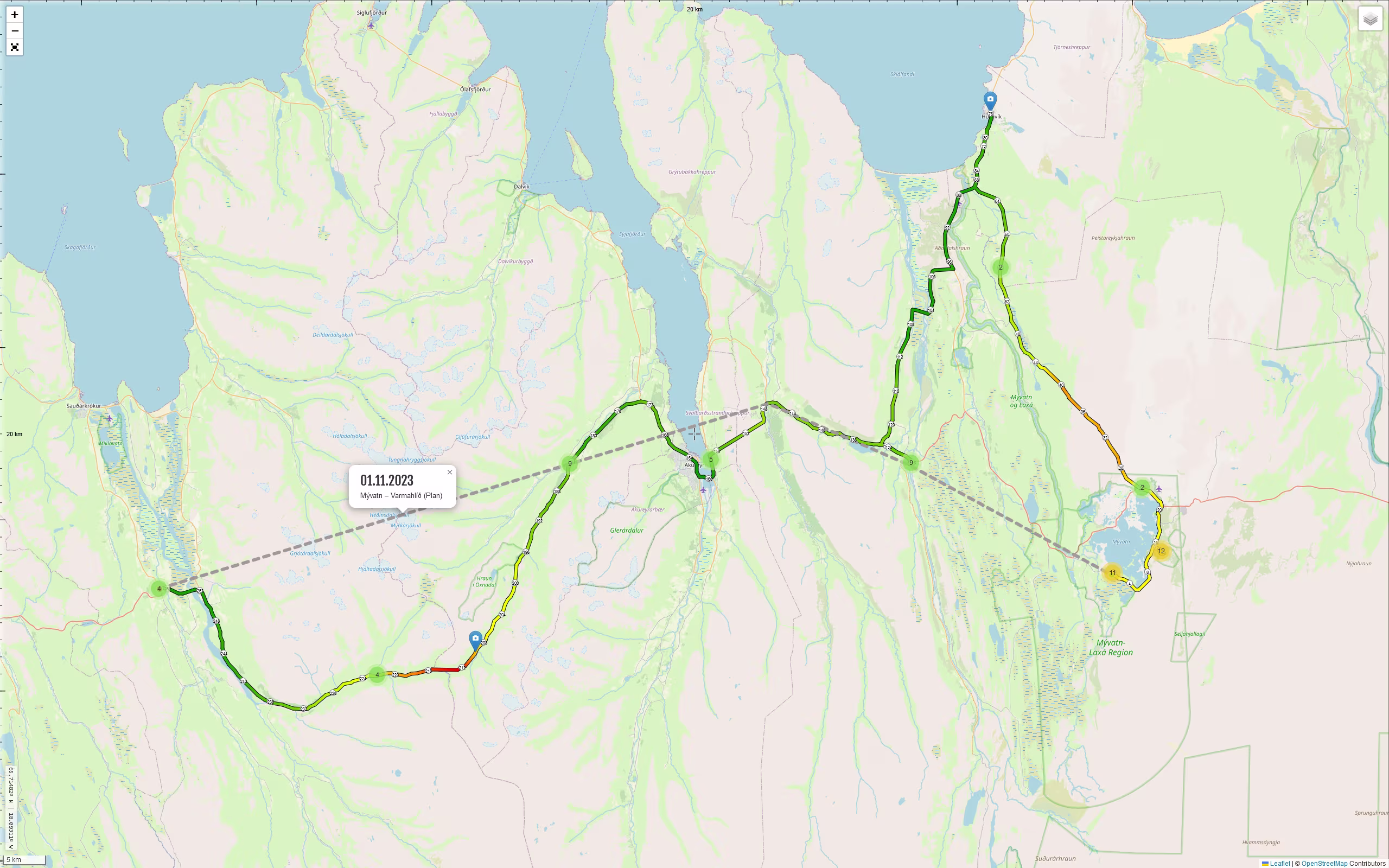 - Die Durchquerung des „Vaðlaheiðargöng“ ist mautpflichtig. Die Alternative über die [84] dauert nur wenig länger und auf ja.is sieht das nicht so super gefährlich aus. Also abhängig vom Wetter könnte man auch die Passstraße benutzen. Einen konkreten Eindruck von der Befahrbarkeit kann man sich hier holen. Höchster Punkt scheint auf ca. 320 m zu liegen.