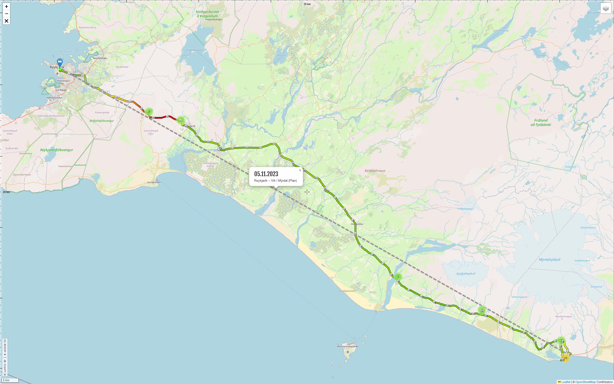 Zwar hätte ich auch die heutige Fahrt noch fast komplett mit der restlichen Tankfüllung bestreiten können, aber ich wollte die Gelegenheit nutzen und an einer Tankstelle in Reykjavík endlich mal 98er Sprit zu tanken. Aber da ist nix zu machen, das gibt es hier nicht. Mein Durchschnittsverbrauch liegt noch bei 7,7 l/100 km. Ich fahre selten 90 km/h, eher maximal 85 km/h.