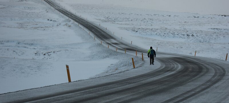 Und dann, folgte das Abenteuer, der Adrenalinkick bis in die letzte Haarspitze. Was aber zunächst nicht danach aussah. Am Ortsausgang von Egilsstaðir zeigte die Tafel -3 °C an und sonst nichts gravierendes. OK dachte ich, dann ist ja alles im grünen Bereich. Vor mir fuhr ein LKW und dahinter ein PKW. Die Straße war frei von Schnee oder Matsch. Es kommen die ersten Kehren, alles läuft prima. Dann kommt der erste Matsch, auch noch alles gut. Der Matsch geht in Schnee über, alles OK. Dann kommen ein paar Schneeverwehungen, da muss man schon gucken wo man lang fährt. Die linke Fahrspur, wo keiner fährt, ist fast komplett frei. Der PKW vor mir fährt dort, also mache ich das auch. Alles läuft.