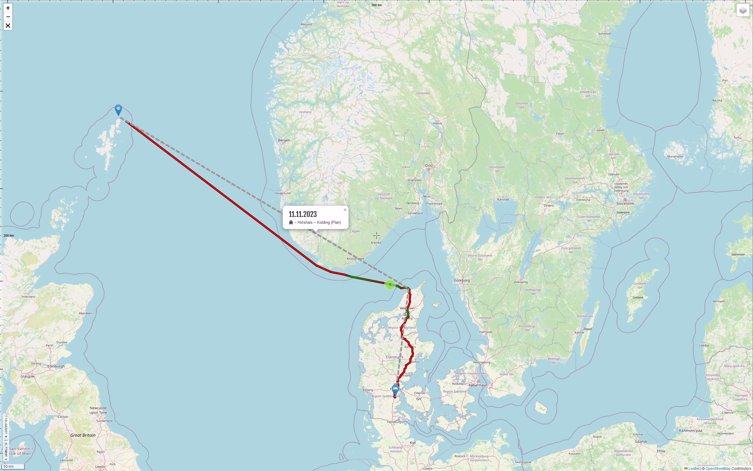 Planmäßig soll das Schiff um 11 Uhr in Hirtshals anlegen. Selbst bei einigen Stunden Verspätung kann man noch eine hübsche Strecke in Richtung Heimat fahren. Die Frage ist, soll man Danmark an dem Tag schon hinter sich lassen? Nach Hamburg wären es ca. 520 km, die Fahrt würde ca. 5 Stunden dauern. Ja, warum nicht. Hmm, das wäre allerdings ungünstig, weil, ich will ja wieder Karrysild mit nach Hause bringen. Den aber ungekühlt so lange im Auto zu lassen, auch nicht so gut. Also lieber doch in Danmark übernachten. In der Nähe von Kolding bin ich fündig geworden, ein Restaurant hat es dort auch, perfekt.