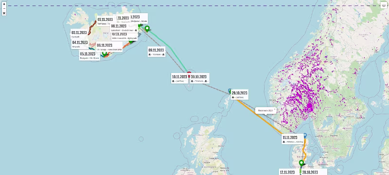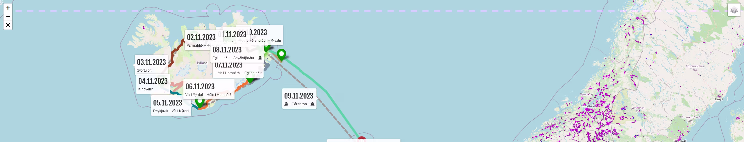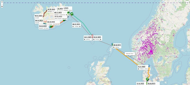| 08.11.2023 | Mi | Egilsstaðir | Seyðisfjörður | MS Norröna | 27 | 00:27 | |||