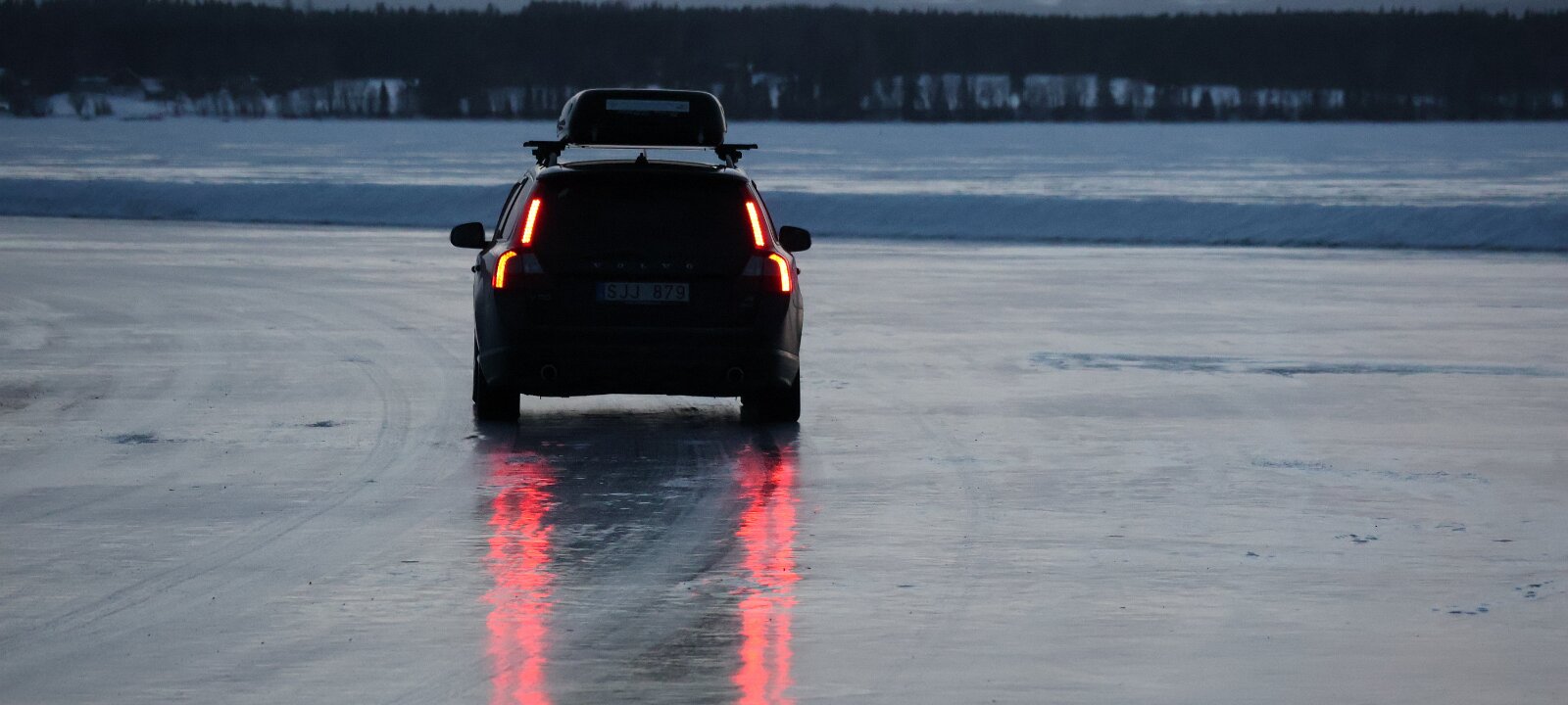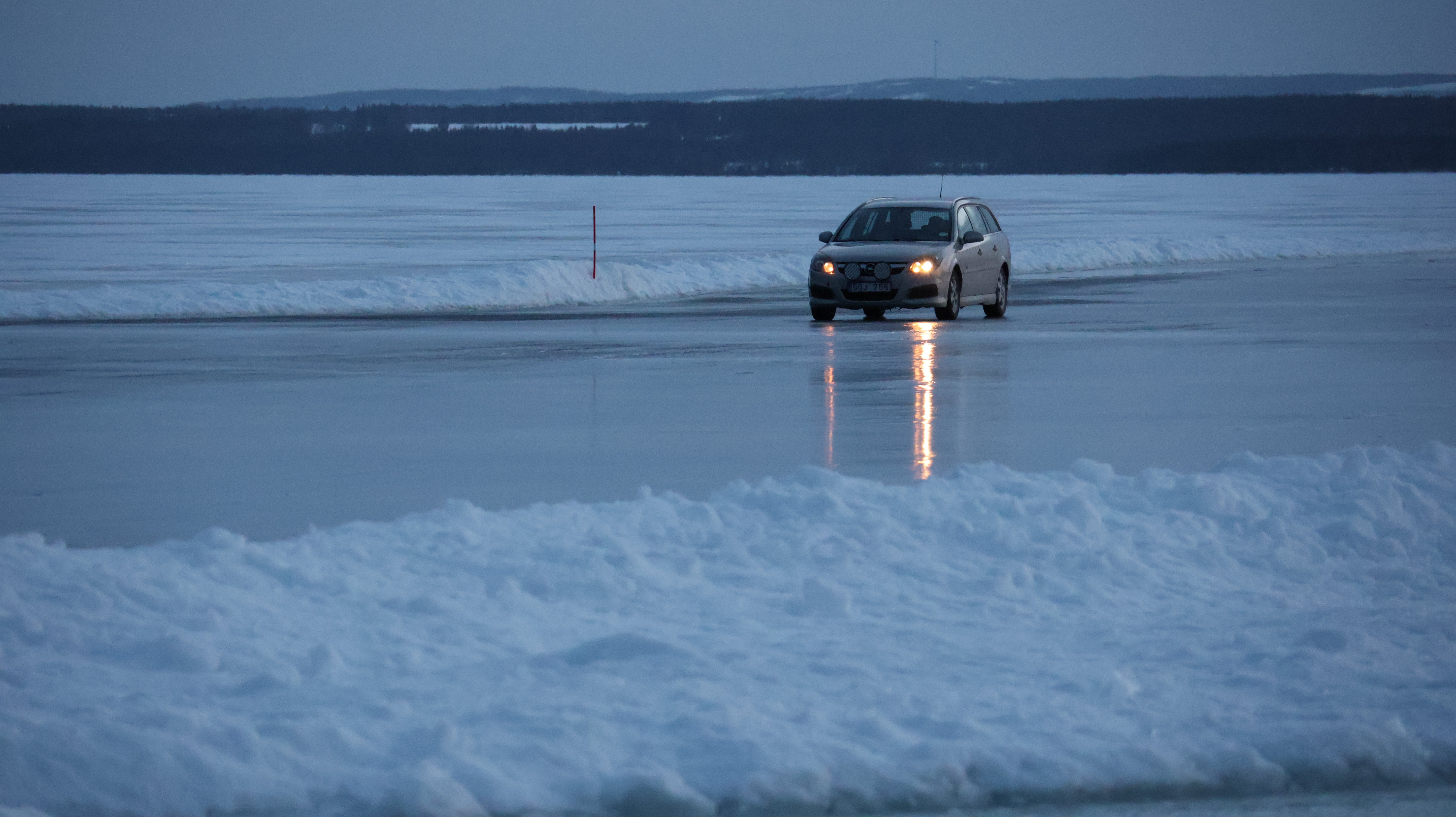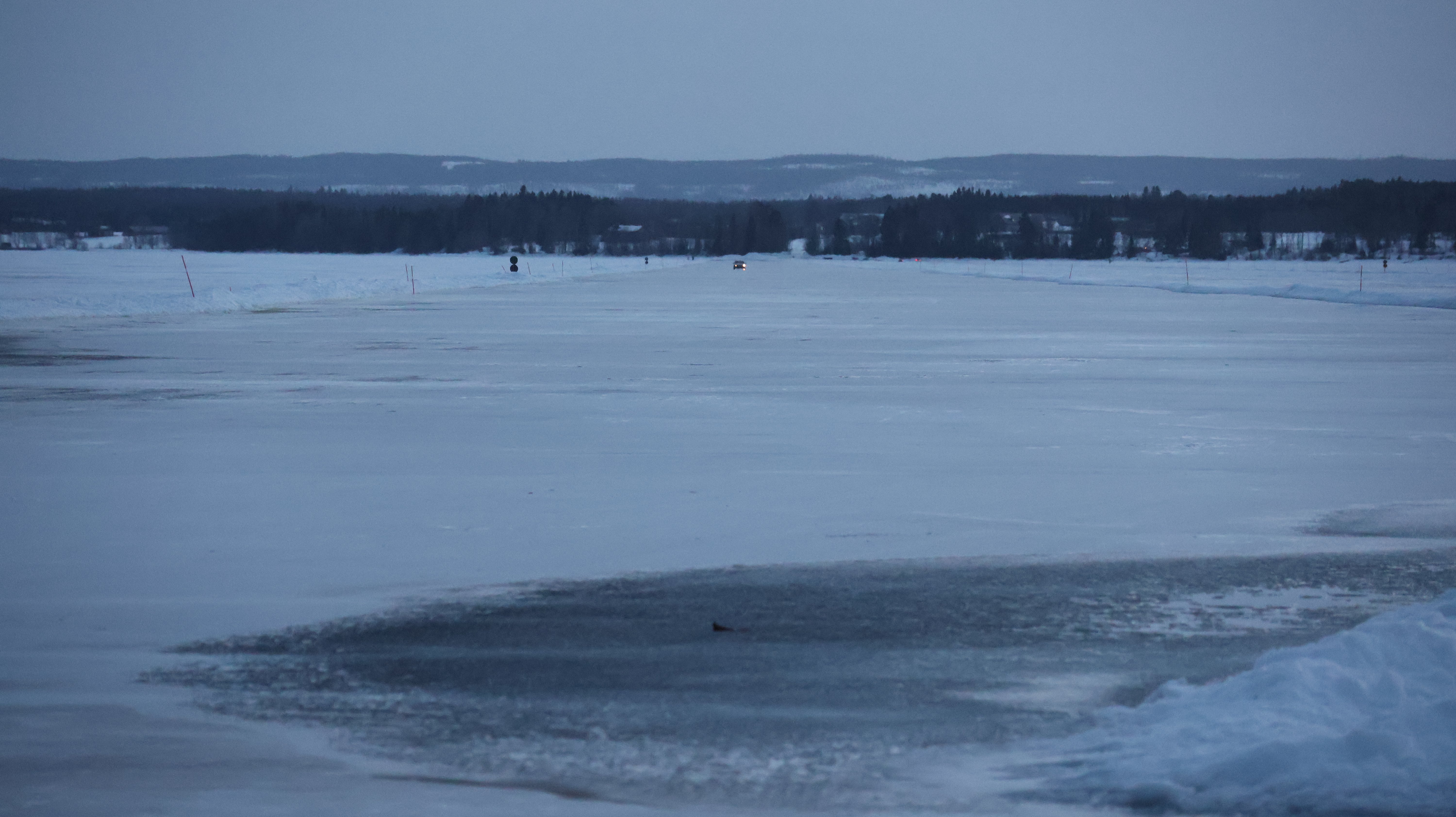 Es wird schon ganz langsam etwas düster, aber man kann das andere Ufer mit dem Ende der Eisstraße noch gut erkennen. Die Straße ist ultrabreit und spiegelglatt. In der kurzen Zeit in der ich da etwas auf dem Eis rum laufe fahren 2-3 Autos aufs Eis und eines kommt von der anderen Seite ans Ufer. Faszinierend. Auch hier werden ein paar Fotos geschossen und dann geht es auch schon wieder die paar Meter ans Auto zurück. Obwohl es total plan da steht hatte ich kurz Bedenken ob ich mich hier nicht festfahre und auf der eisigen Fläche durchdrehe. Aber es geht gut, das Füßchen kitzelt das Gaspedal nur äußerst bedacht. Der Weg durch den Wald geht ganz leicht bergauf, minimal, und da, zu forsch am Gas und die Räder drehen ganz leicht durch, also, gut, dann wieder ganz piano.