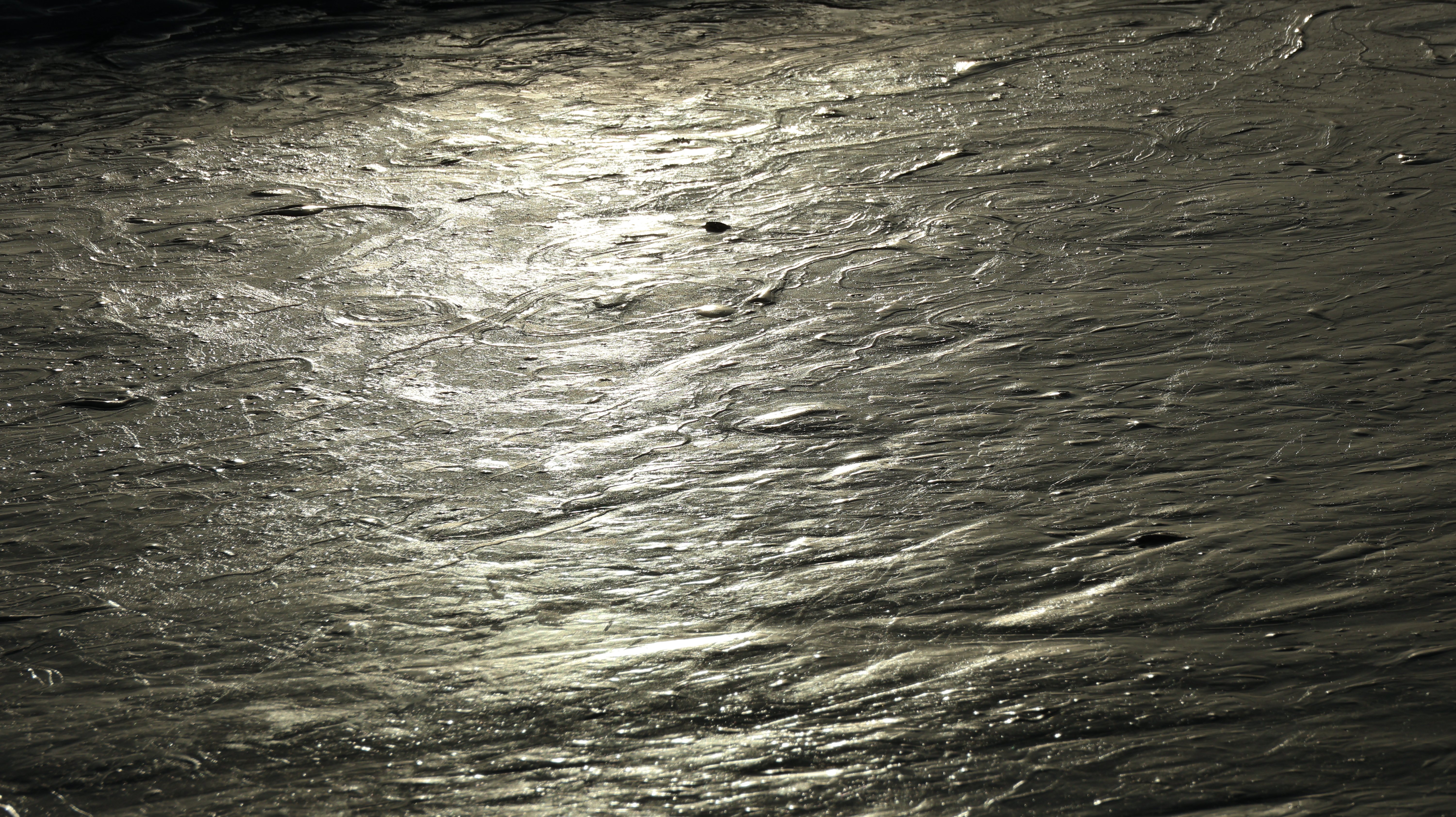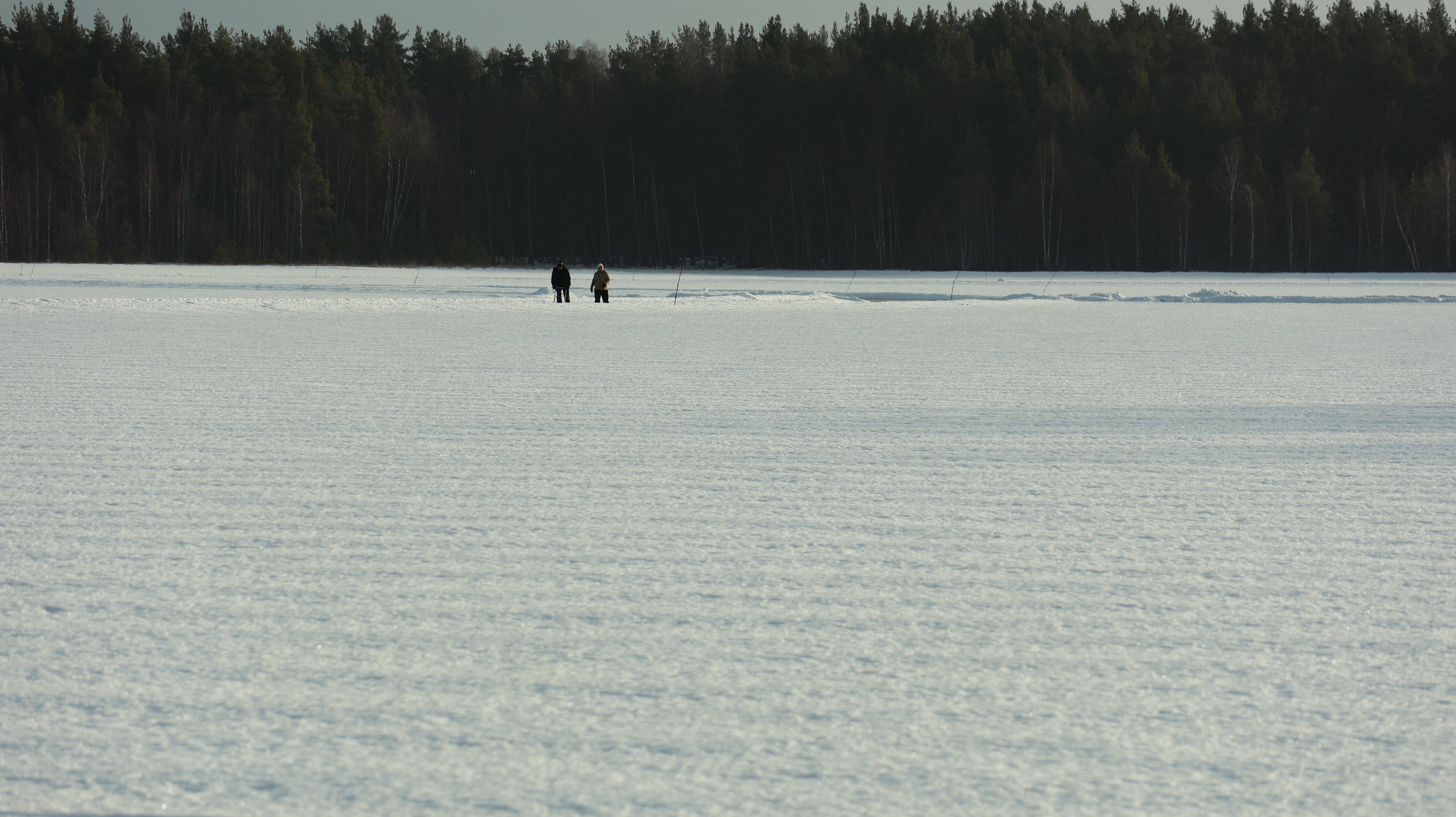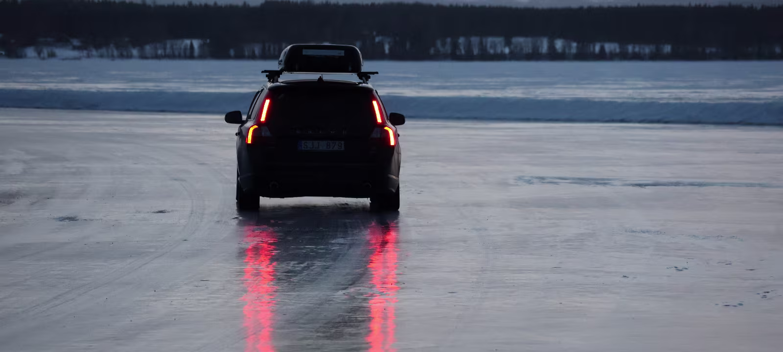 Es wird schon ganz langsam etwas düster, aber man kann das andere Ufer mit dem Ende der Eisstraße noch gut erkennen. Die Straße ist ultrabreit und spiegelglatt. In der kurzen Zeit in der ich da etwas auf dem Eis rum laufe fahren 2-3 Autos aufs Eis und eines kommt von der anderen Seite ans Ufer. Faszinierend. Auch hier werden ein paar Fotos geschossen und dann geht es auch schon wieder die paar Meter ans Auto zurück. Obwohl es total plan da steht hatte ich kurz Bedenken ob ich mich hier nicht festfahre und auf der eisigen Fläche durchdrehe. Aber es geht gut, das Füßchen kitzelt das Gaspedal nur äußerst bedacht. Der Weg durch den Wald geht ganz leicht bergauf, minimal, und da, zu forsch am Gas und die Räder drehen ganz leicht durch, also, gut, dann wieder ganz piano.