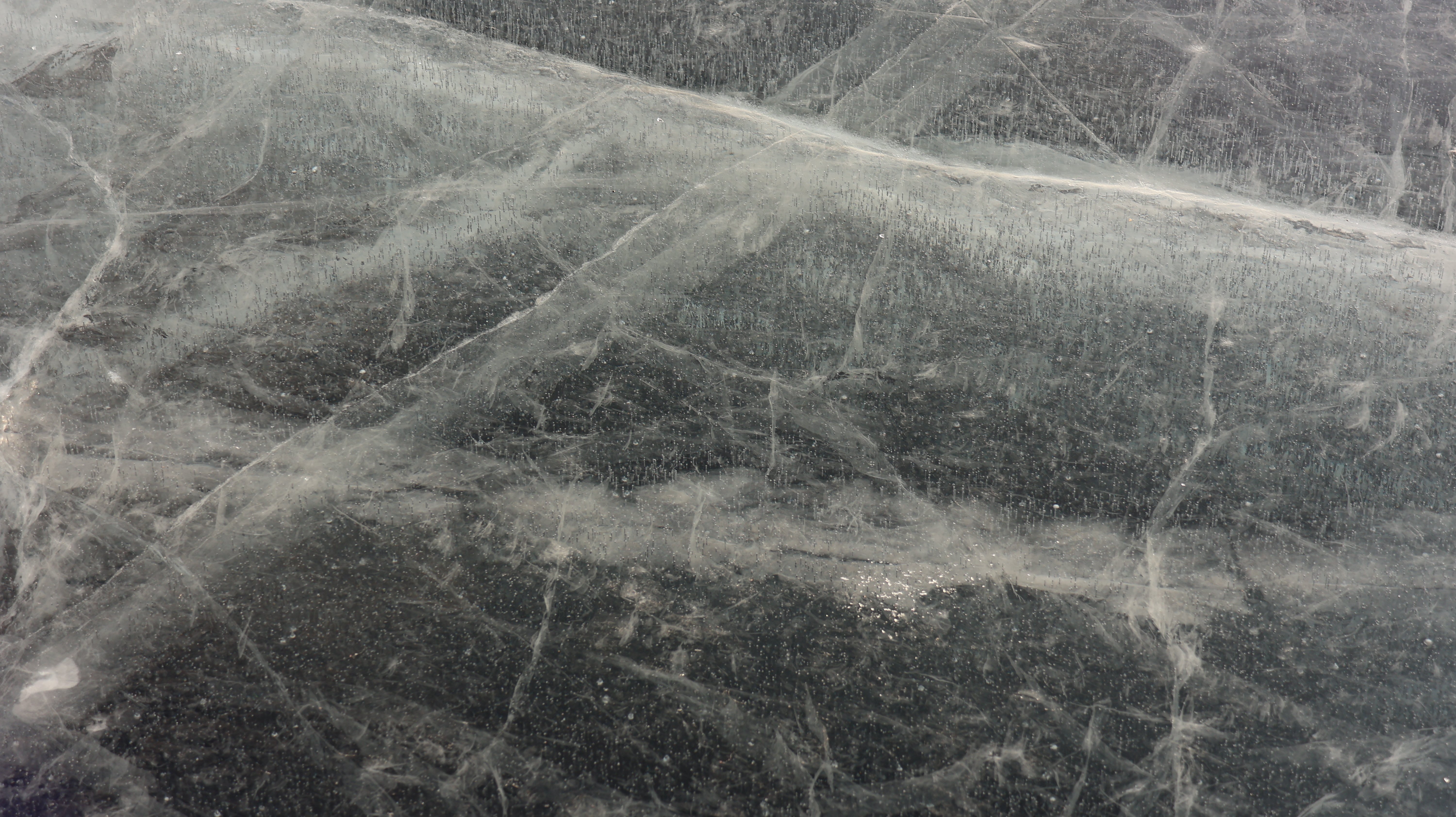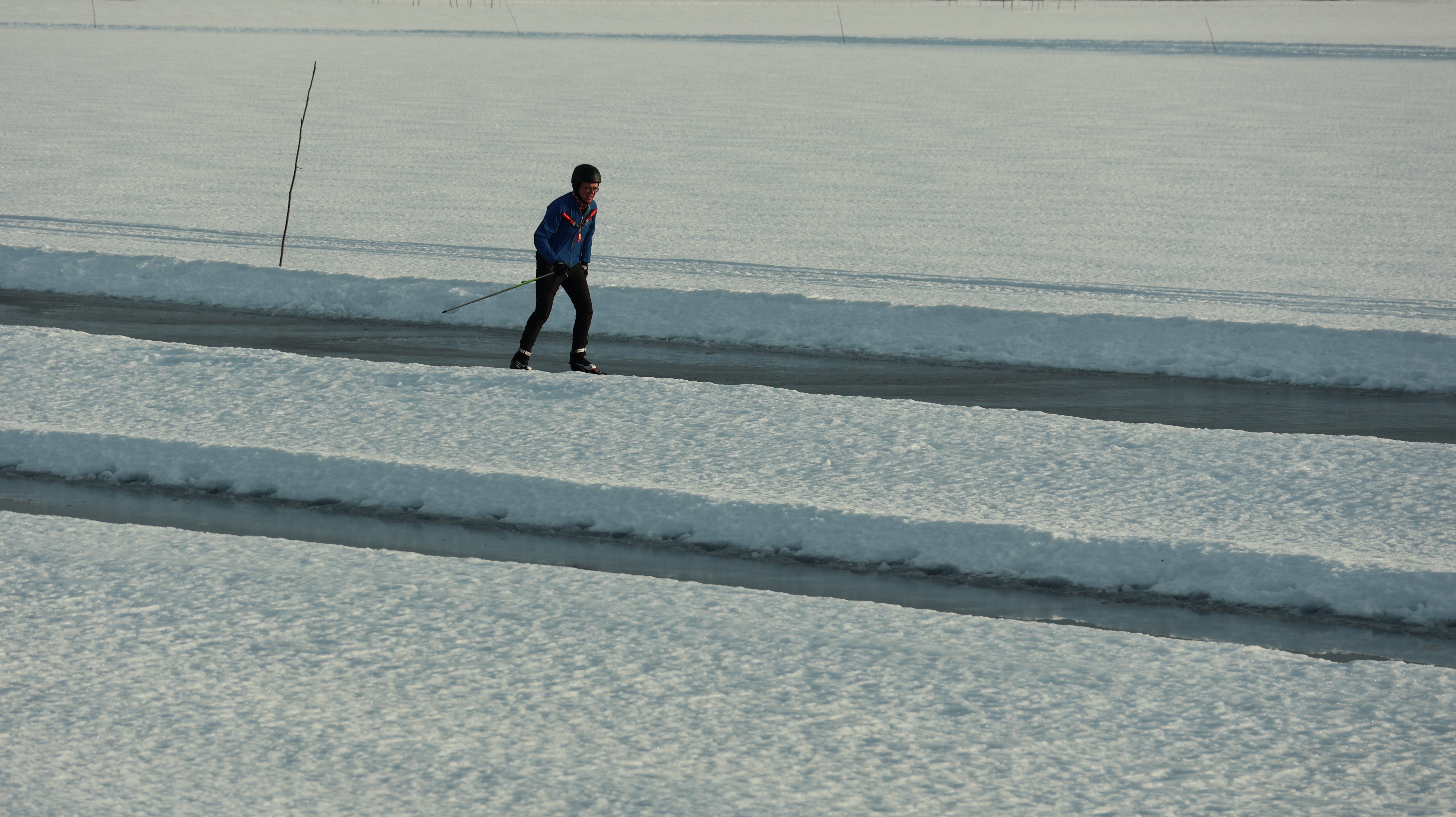 Der Parkplatz in der Nähe des Bahnhofs wird zielsicher angefahren, er ist erstaunlich leer, noch keine Handvoll Autos stehen dort. Und auf dem Eis ist auch fast gähnende Leere, ich erkenne drei Leute. Der Stand des Skiclubs war auch nicht vor Ort. Sowohl der Parkplatz als auch der Weg zum zugefrorenen See war mehr oder weniger spiegelglatt. Da gibt es gar kein Vertun, die Spikes werden angeschnallt. So läuft es sich wie auf Schienen. Es gibt zwei gespurte Stränge auf dem See, die breitere Spur ist den Schlittschuhläufern vorbehalten die andere für Fußgänger. Das Eis ist blank, man kann gut sehen wie dick es ist. Es hat Sprünge in allen Formen, kreuz und quer. So richtig super wohl fühle ich mich nicht. Vermutlich ist alles so sicher wie es sein kann, aber mir ist das nicht geheuer. Ich laufe etwas verstohlen herum, gucke den drei Leuten zu die sich wie kleine Punkte langsam bewegen. Dann drehe ich wieder um an Land, besser. Noch ein kurzer Gang auf einen Anlegesteg, ein paar Fotos für ein weiteres Panorama, klick, klick, klick. Zurück zum Auto, weiter geht es.