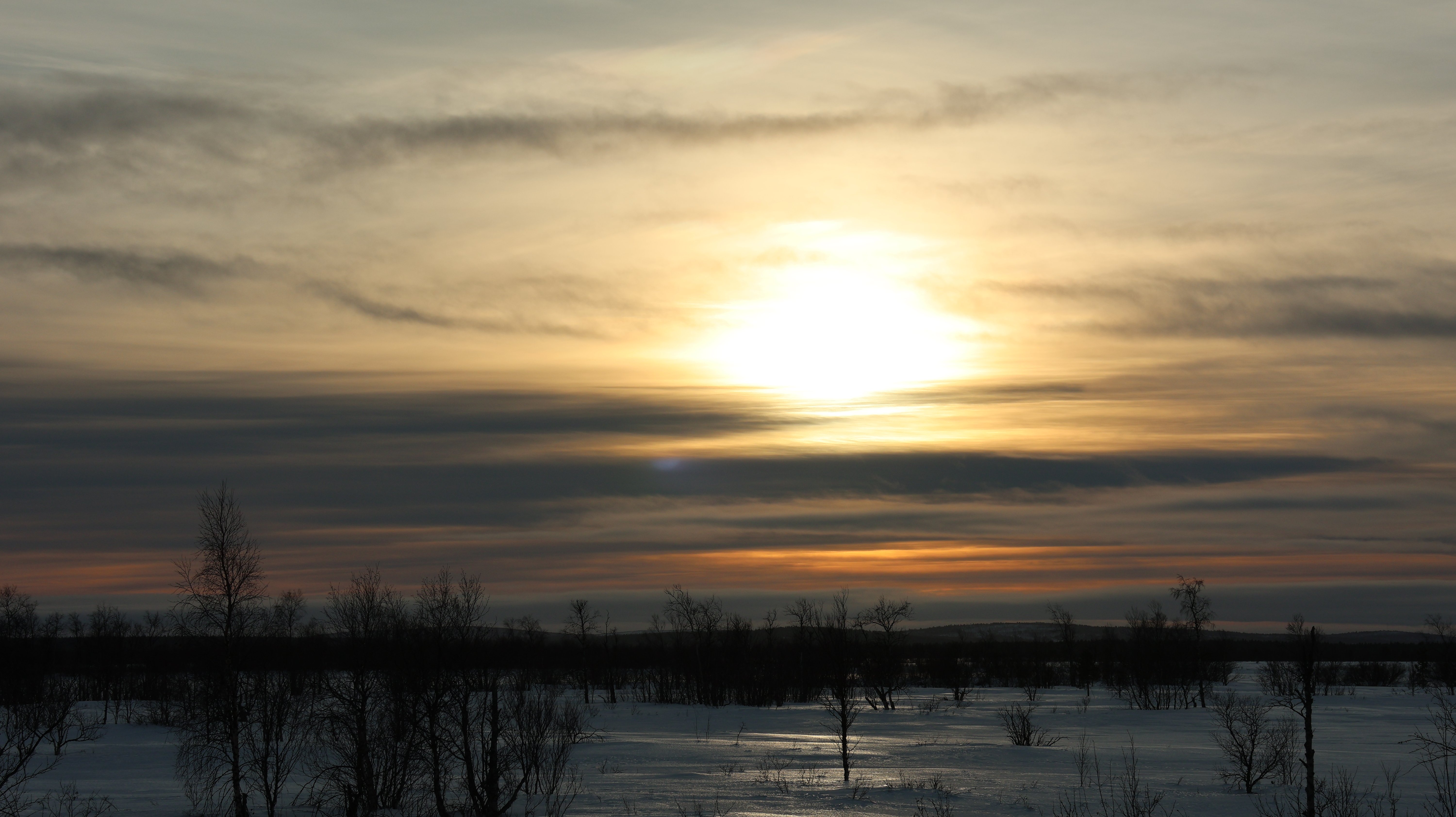 Temperaturmäßig lagen wir minimal unter dem Gefrierpunkt. Es dämmerte schon vor sich hin, der Himmel komplett grau. Spektakulär geht anders, aber alles Klagen hilft nicht. Die Straßenverhältnisse sind aber bestens, es ist wenig los und man kann fahren was erlaubt ist. Lange vor Karesuando hängt ein LKW vor mir, dem ein Fahrzeug mit Blinklicht vorausfährt. Es scheint ein Transport mit Überbreite zu sein, der aufgewirbelte Schnee lässt keine genauere Einschätzung der Lage zu. Aber das Duo hat einen ganz schönen Zoppen drauf und ist nicht wirklich eine Bremse.