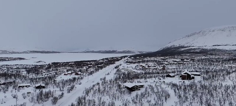 Am Ortseingang von Kilpisjärvi dann endlich ein großer Parkplatz, gut geräumt. Hier das Fluggerät zu starten war vermutlich auch wieder grenzwertig, weil die Straße nicht sehr weit war und das erste Haus ebenfalls. Egal.