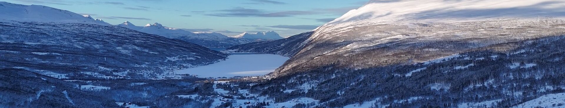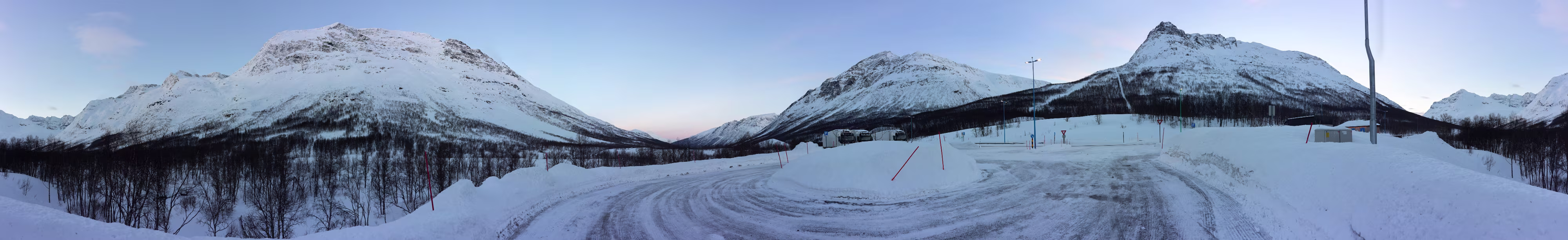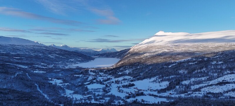 Geräuschmäßig war das auf jeden Fall eine angenehme Nacht. Frühstück hatte ich keines gebucht, also alles packen, ins Felsenparkhaus und los geht es. An der Shell-Tankstelle erstehe ich einen großen Kaffee und ein Matpakke. Zwei der Brote werden gleich vertilgt. Wettermäßig ist es ein Traum, -4 °C kalt, Schnee ohne Ende, fast kein Wölkchen zu sehen. An einem Parkplatz an der [E6] der wenigstens ein paar Meter neben der Straße liegt halte ich an und lasse das Fluggerät steigen. Wirkliche Routine ist das für mich alles noch nicht. Ich fliege nur auf Sicht, mich nur mit dem Display zu orientieren kriege ich noch nicht hin.
