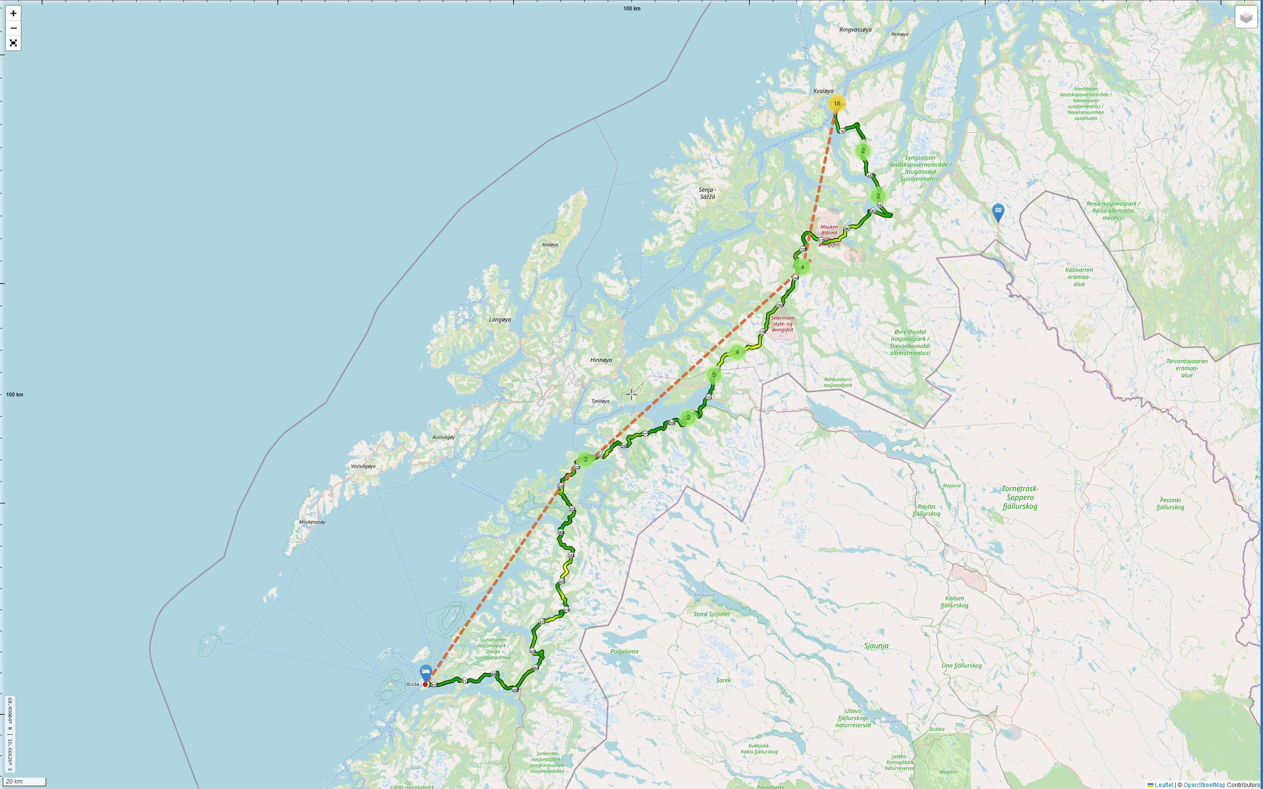 In 2023 war das eine sehr anstrengende Fahrt. Es hatte geregnet und geschneit. Wenn man Narvik erreicht hat, dann hat man es allerdings geschafft, dann schlängelt sich die [80] am Fjord entlang und es gibt keine wirklichen Hürden mehr zu überwinden. Die Abstecher zum „Bardufossen“ und „Målselvfossen“ haben einige Zeit gekostet. Falls das Wetter dieses Mal schöner wäre würde ich allerdings evtl. noch mal an den „Bardufossen“ fahren, vom Weg her ist das kein allzu großer Umweg.