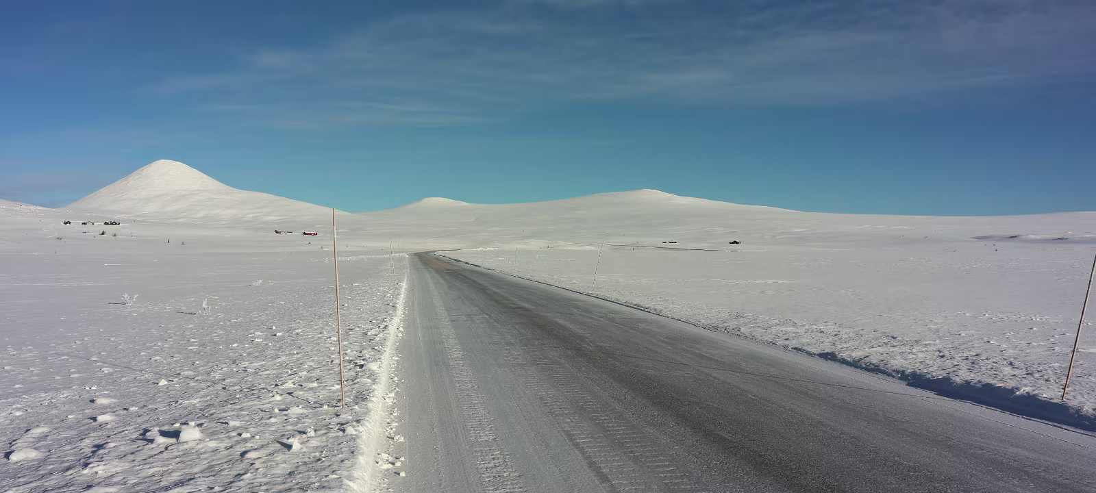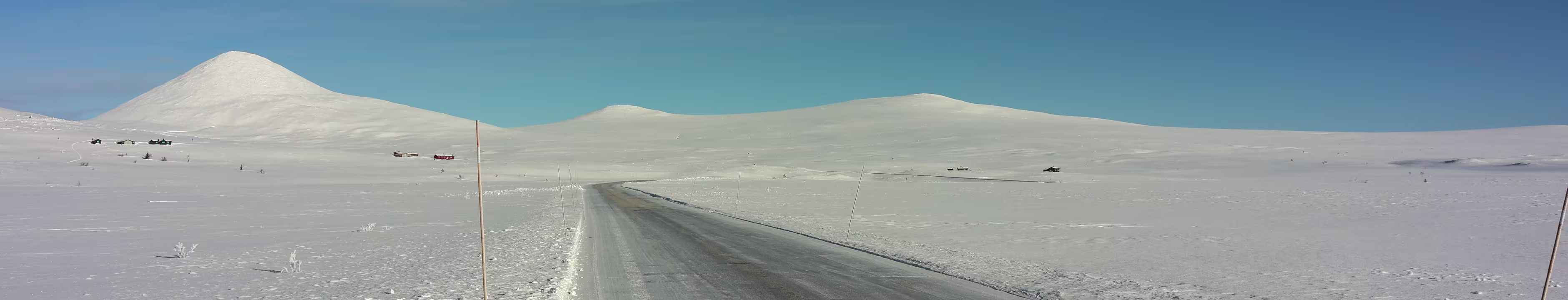 Dann steht (fährt) man unvermittelt auf einer Hochebene. Vorher fuhr man noch durch Wald durch aber nun waren kein Baum und kein Strauch mehr zu sehen. Nur noch weiß, in allen Richtungen, die Sonne knallte herunter. Einfach atemberaubend. Eine völlig neue Erfahrung, so etwas hatte ich in Norge noch nicht gesehen. Wirklich wo mal anhalten war nicht möglich, alle Parkmöglichkeiten waren komplett verschneit und nicht geräumt. Ich gleite langsam durch die völlig fremde Welt. Irgendwo wird man da doch mal wo anhalten können. Ohne Foto, das geht ja gar nicht. Blick in den Rückspiegel, nee, da ist keiner, Blick nach vorne, da kommt keiner. Anhalten, raus aus der Karre. klick, klick, klick. Ist das frisch hier, die Sonne brettert zwar und macht auch bestimmt etwas warm, aber gegen zweistellige Minusgrade kommt so schnell nix an. Gut, wenigstens ist das mal festgehalten. Wieder einsteigen.