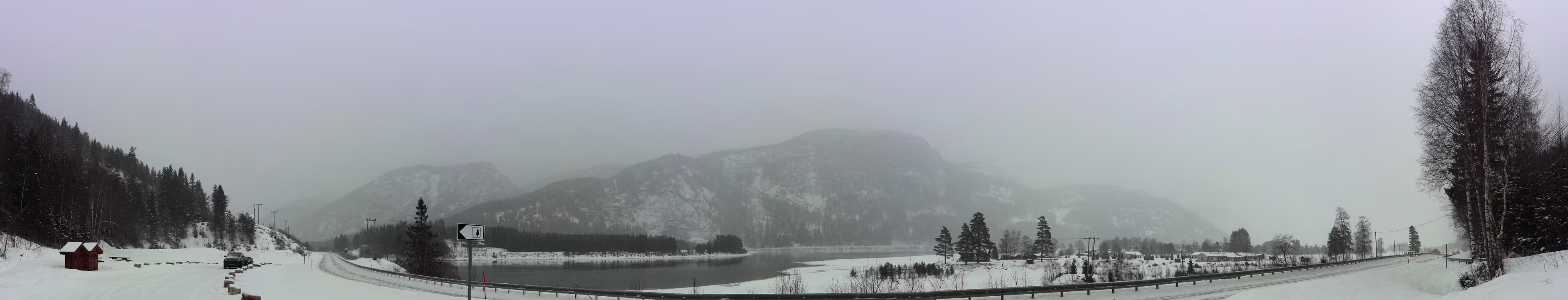 So komme ich auf der Hochebene an. Da fetzt teilweise ein heftiger Wind um die Ecken, manchmal sieht man für ein paar Sekunden nix als Schneewolken. Dann recht unvermittelt bin ich schon in Hovden, das ging ja schnell. Das Wetter beruhigt sich, es schneit zwar weiter ganz leicht aber der Wind legt sich. Langsam wird es auf der Straße belebter, aber viel Verkehr ist das nicht. Es geht ständig abwärts, es lässt sich gut fahren. Die Temperatur fällt minimal. Am Wasserfall „Reiårsfossen“ halte ich an. Sieht sehr imposant aus, er ist größtenteils zugefroren, aber an einigen Stellen stürzt doch viel Wasser herab. Schwer zu sagen wie hoch er ist, aber es ist nicht wenig.