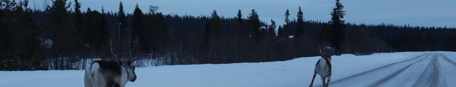 Jokkmokk – Tromsø Rentiere rennen auf der Straße.