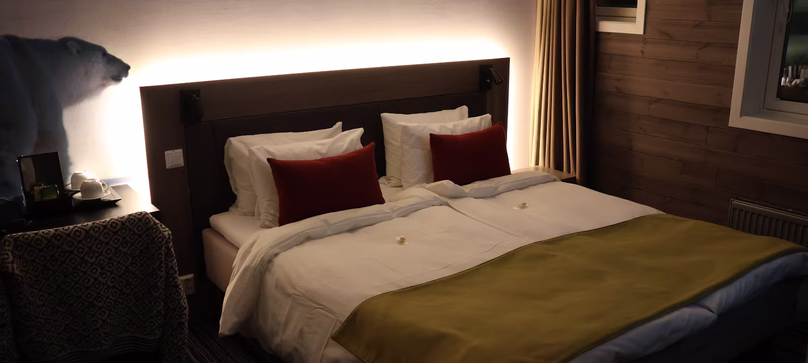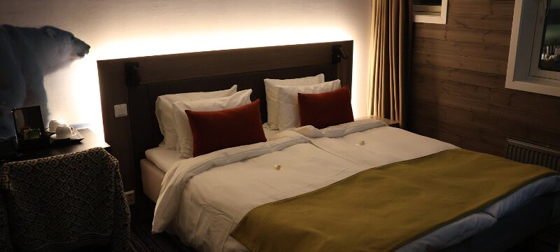 Meine Tasche kommt recht zeitig, ich steige in einen der beiden Busse ein und warte bis auch die letzten Passagiere ihr Gepäck erhalten haben und im Bus sitzen. Komisch, man kann nur noch eine einfache Fahrt buchen, kein Return-Ticket mehr. Erster Halt ist das „Svalbard Hotell | Polfareren“. Ich steige als Erster aus und bin auch gleich an der Rezeption. Es ist das - mal nachrechnen, „Coal Miners’ Cabins“, „Mary-Ann’s Polarrigg“, „Radisson Blu Polar Hotel“, „Svalbard Hotell | The Vault“ - das fünfte Hotel das ich habe. Und, wow, was ein schönes Zimmer, mit einem großen Zweier-Sofa, großes Badezimmer mit Badewanne. Ich bin wirklich positiv und sehr angenehm überrascht.
