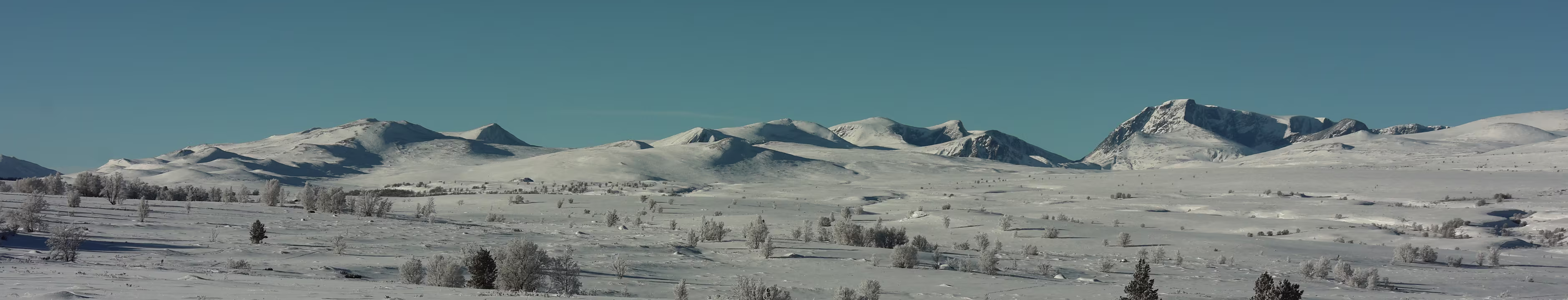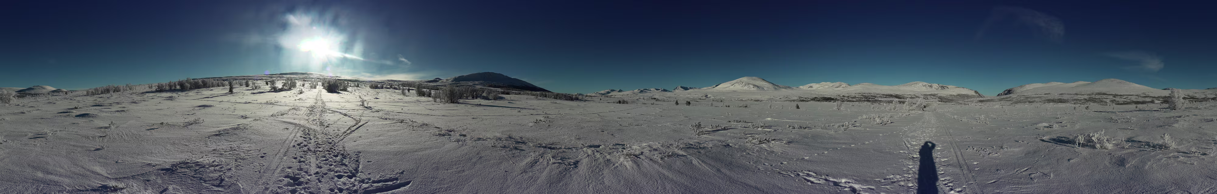 Es geht das Dovrefjell hoch. Die Sicht ist superklar. Anhalt am Parkplatz wie immer. Wollen doch mal sehen wie hier der Schnee trägt. Das klappt ja bestens, man versinkt kaum. Beim Aussteigen hatte es -24° C, gut eingepackt ist das kein Thema. Nach einer Weile gibt es einen Wegweiser. Von da geht eine Strecke schnurstracks leicht den Hügel hoch. Nun, wie soll ich gehen, lassen wie die Frage mal offen und gehen einfach mal weiter. Regelmäßig drehe ich mich um habe immer wieder eine leicht veränderte Sicht. Es wird ohne Ende Material für Panoramen geschossen, das gibt viel Arbeit zu Hause.