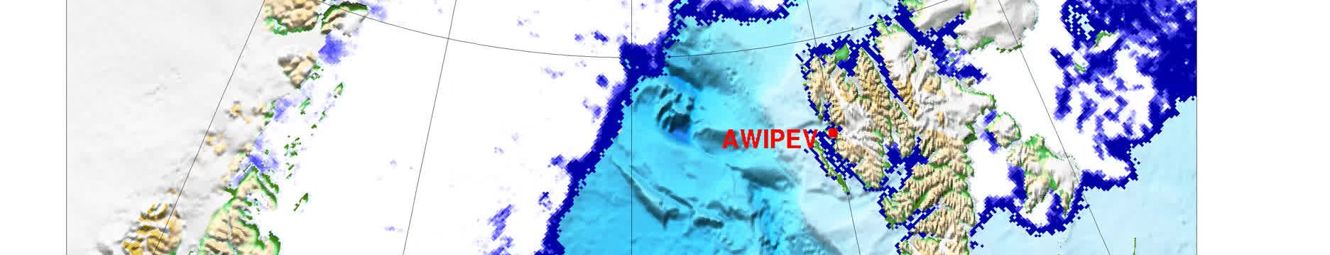 Die Eiskonzentration, abgeleitet aus Daten des passiven Mikrowellenradiometers AMSR2 gib an, wieviel Prozent der Oberfläche innerhalb eines Gebietes mit Meereis bebedeckt ist. Diese Information wird farbkodiert und halbtransparent auf unseren Karten angezeigt und ist in einer Auflösung von 3 km vorhanden. Weitere Informationen zum Eiskonzentrationsprodukt siehe: