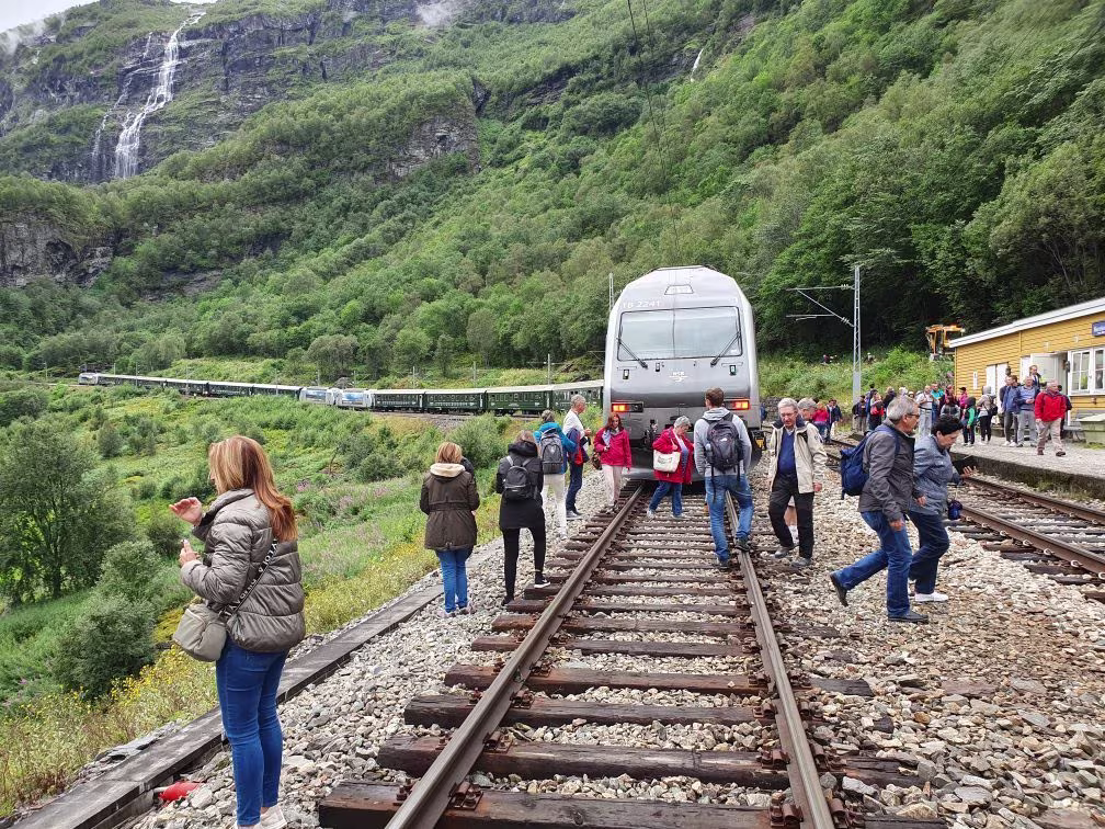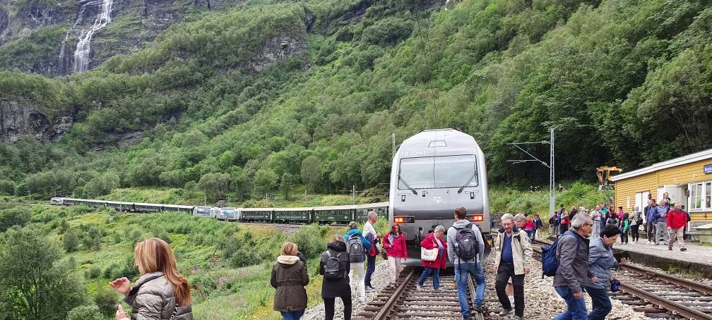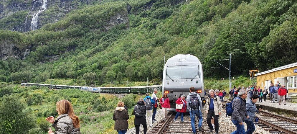 Flåmsbana ist eine Nebenstrecke der Bergenbahn und führt vom Bahnhof Myrdal auf 867 Metern Höhe zum Aurlandsfjord. Der Platz ist eine sehr beliebte Touristenattraktion und 2016 fuhren fast eine Million Reisende die kurze Strecke nach Flåm hinunter.