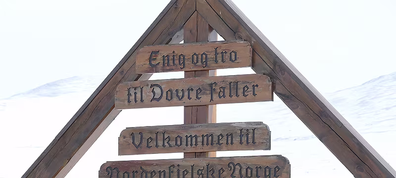 Das „Hero“-Bild zeigt einen Wegweiser an einem Parkplatz am Dovrefjell-Sunndalsfjella-Nationalpark am 13.03.2022.