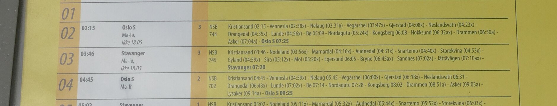 | 10 | Bodø | yr | 02:30 | 03:30 | 01:00 | 02:30 | 03:30 | 01:00 | 02:30 | 03:30 | 01:00 | 02:30 | 03:30 | 01:00 | |