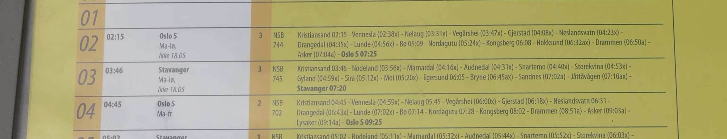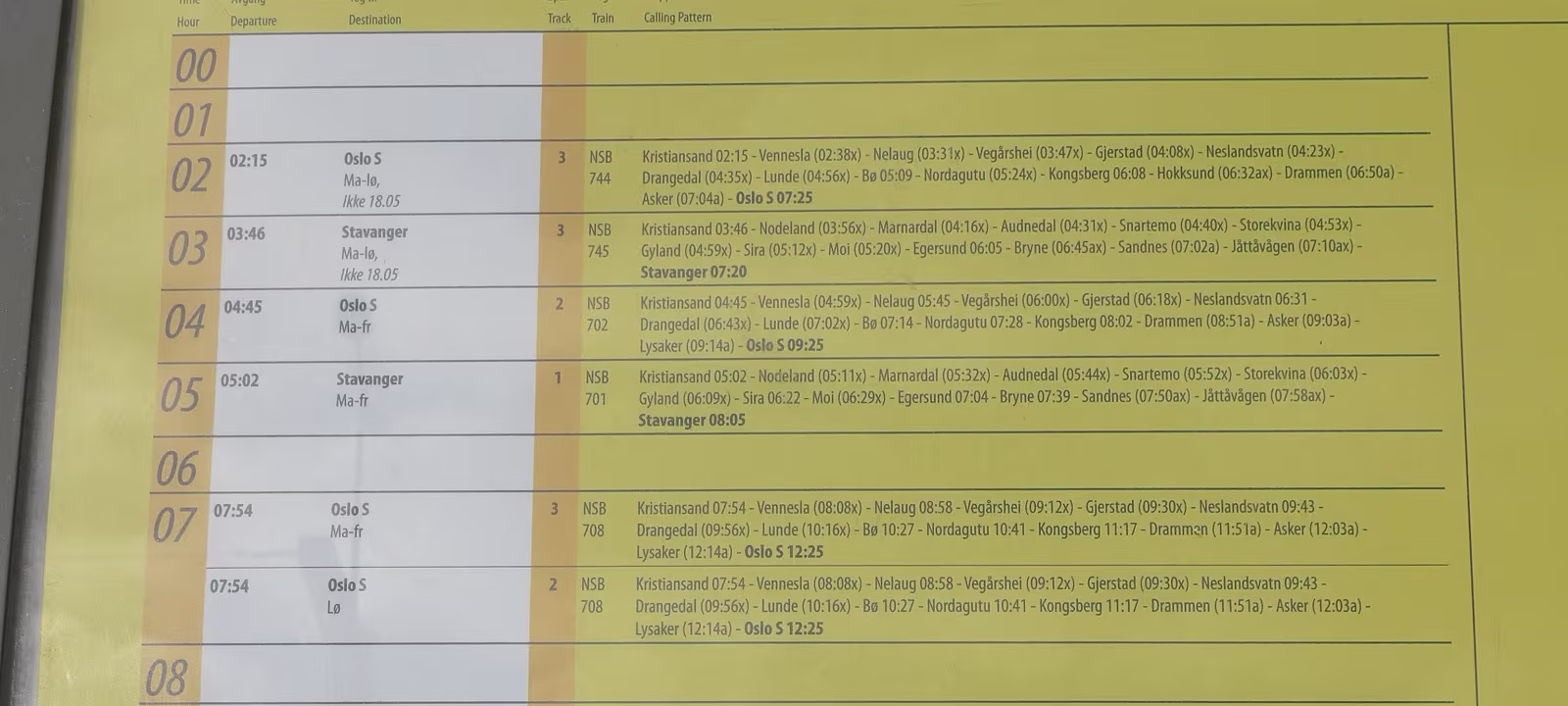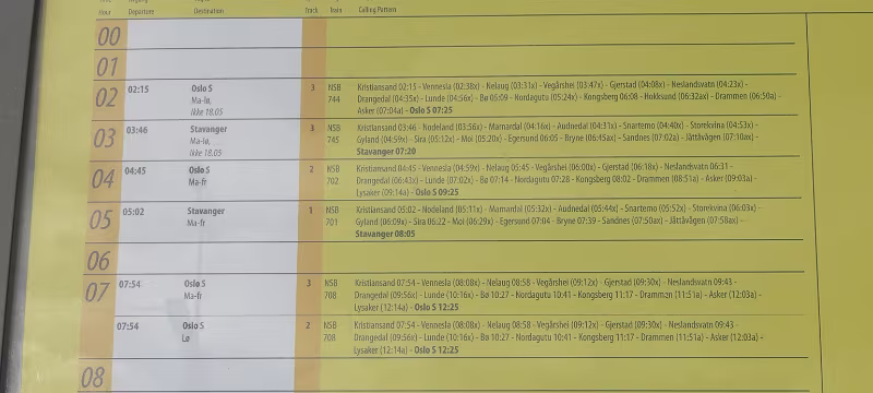 Das „Hero“-Bild zeigt den Zugfahrplan am Bahnhof in Kristiansand.